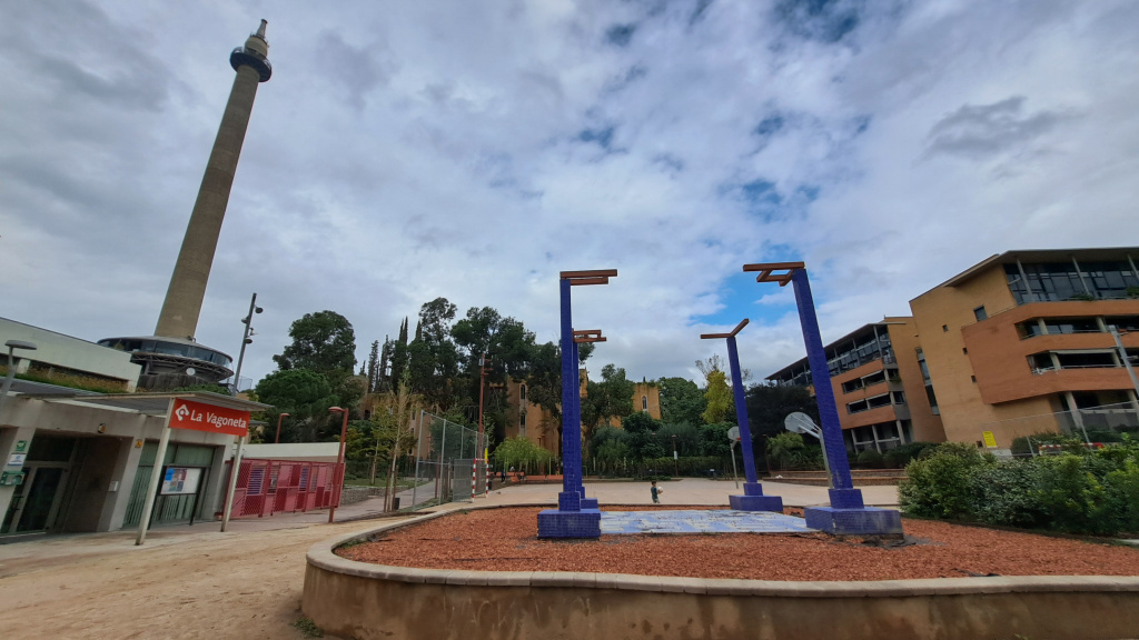 A terra, a l'interior d'aquest cub ideal, hi ha dibuixat un laberint de rajoles blanques i blaves per a divertiment dels infants, un laberint que alhora simbolitza el difícil procés de consolidació de la zona Walden i cada columna té un significat: