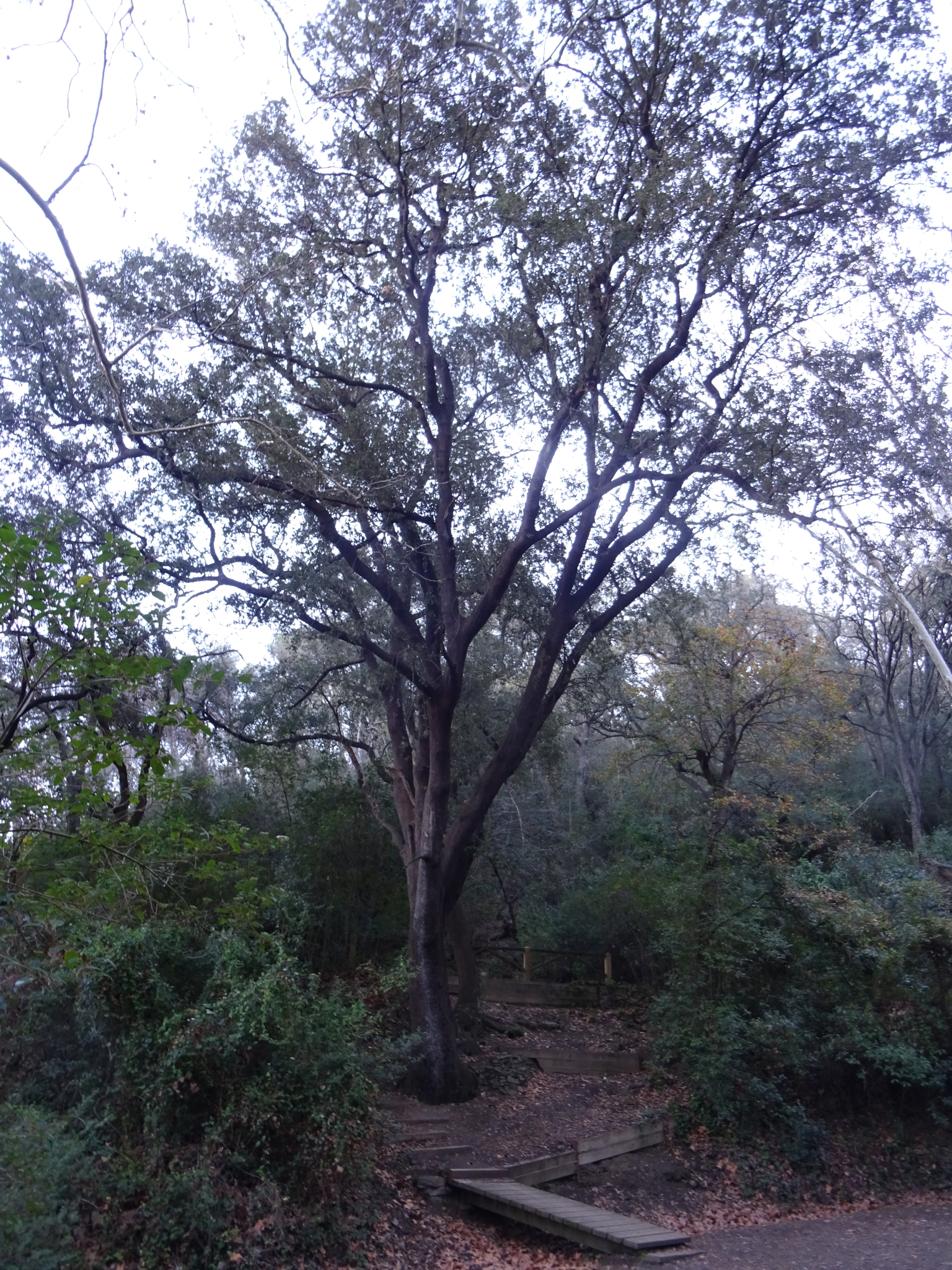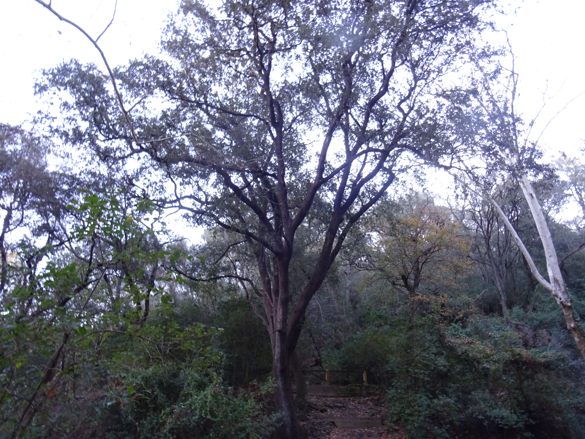 El Quercus ilex L és de la família de la fagaceae, originari de l’àrea mediterrània. El nom comú en català és alzina. Quercus és el nom llatí de les alzines i els roures i ilex és el nom amb què els grecs anomenaven les alzines. L’arbre pot mesurar entre 20 i 25 metres d’alçada, amb capçada esfèrica, ampla i densa. L’escorça és llisa i de verd grisenc, però amb el pas dels anys pren unes tonalitats grises i amb escletxes verticals. Les fulles, fan entre 3 i 8 centímetres de llarg, de color verd fosc i brillant i, a l’interior són clares i pubescents.