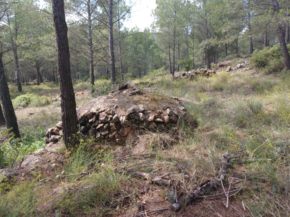 Barraca de planta circular construïda amb la tècnica de la pedra seca formant part d’un marge també de pedra seca.