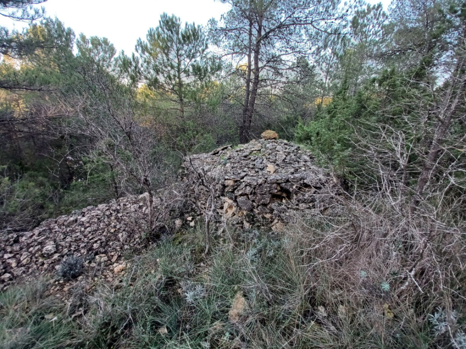 Barraca de planta circular construïda amb la tècnica de la pedra seca i adossada a un marge de pedra.