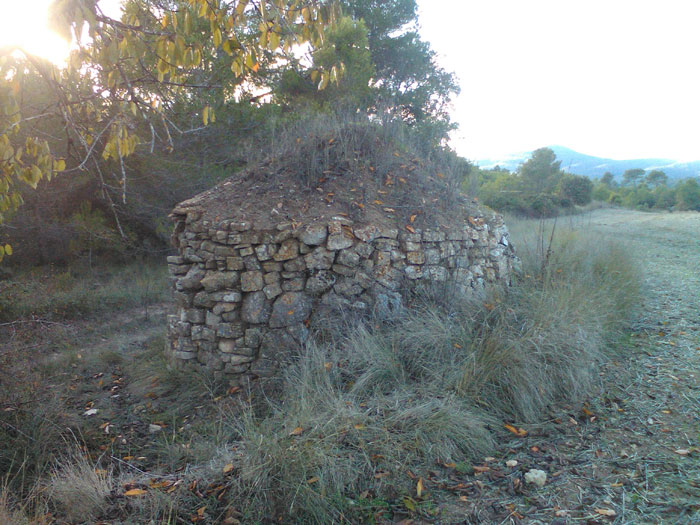 Barraca aïllada de planta circular situada a tocar d'un camp de conreu i construïda amb la tècnica de la pedra seca.