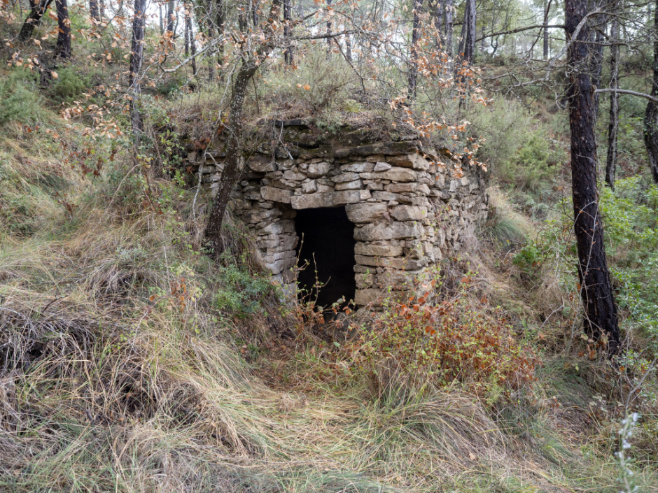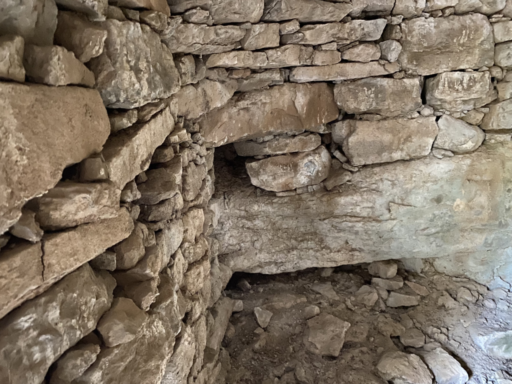 A l'interior hi ha un bancal d'uns 50 cm d'ampla i uns 40 cm d'alçada.