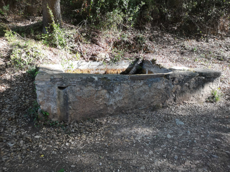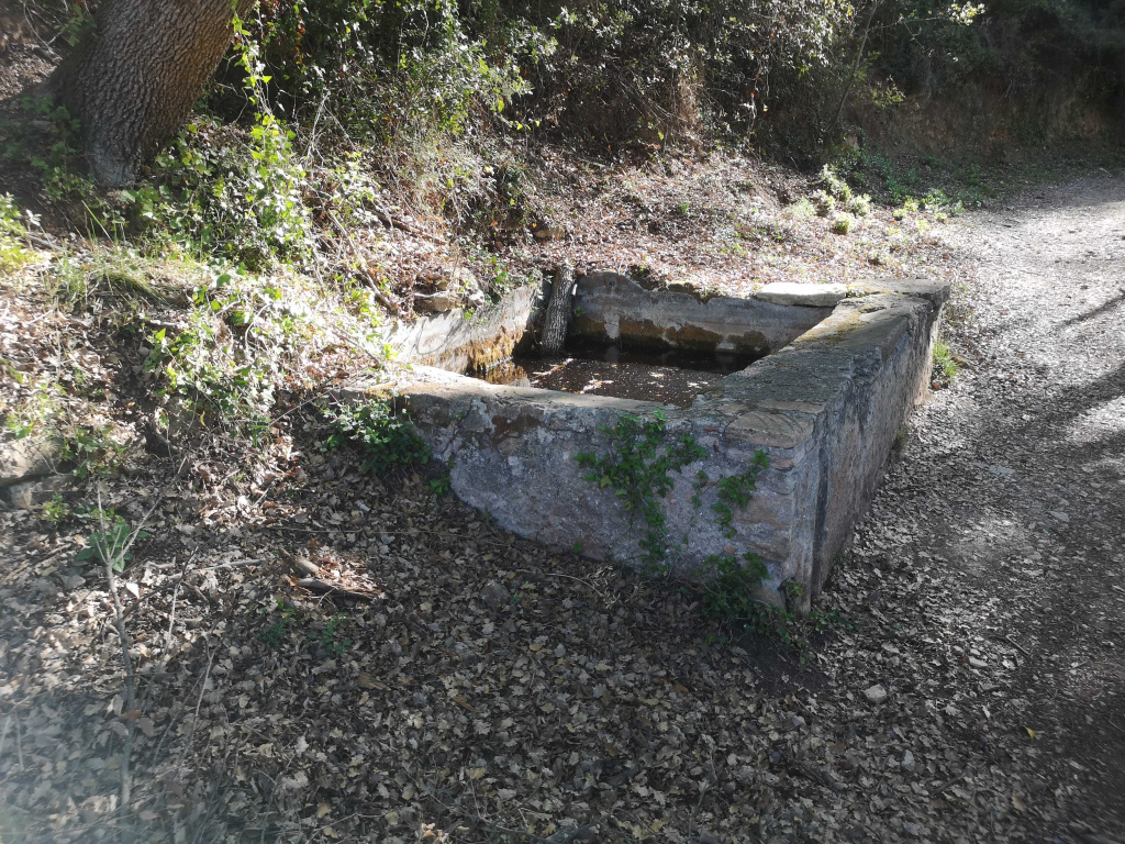 L'aigua arriba a la bassa a través d'un broc en un dels murs de contenció que podria ser de l'encaminament d'una font natural d'alguna cota superior. A l'altre extrem de la bassa hi trobem un forat que actuaria de sobreeixidor. Segons fonts orals del veïnat, malgrat estar en un moment de sequera excepcional on bona part de les fonts del poble són seques, la bassa té aigua, i pel broc hi ha un degoteig constant.