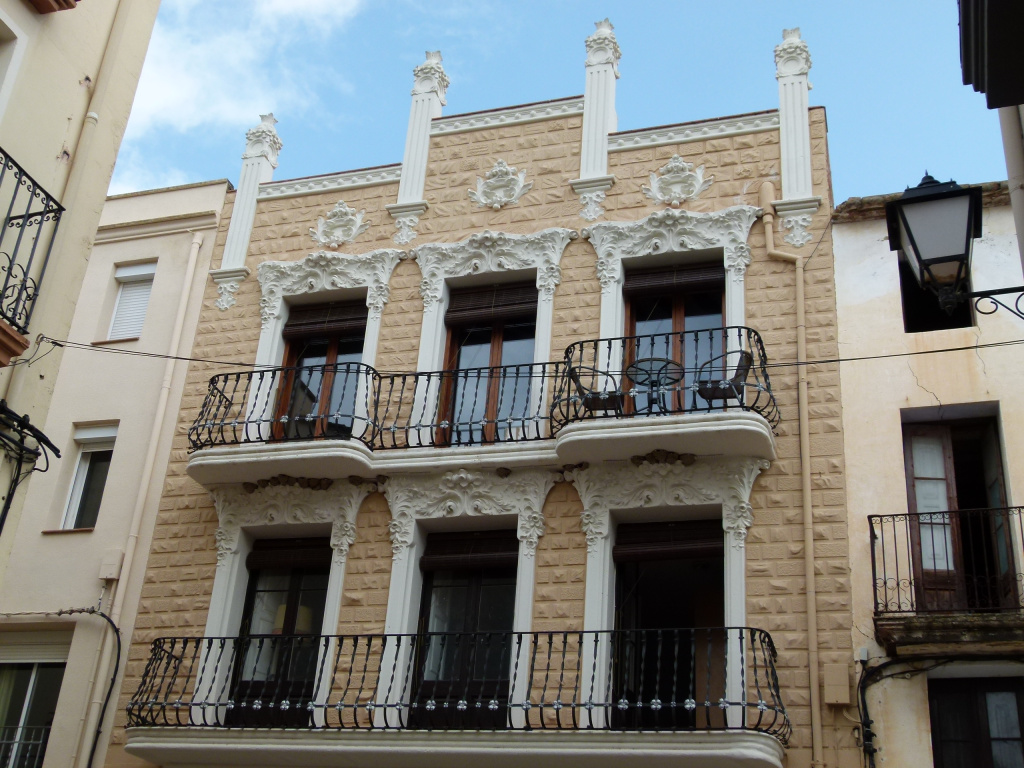 Al primer pis destaca un balcó corregut amb la mateixa tipologia de baranes. Els barrots, corbats cap a la part inferior, generen un efecte de volum. Les obertures estan emmarcades per motllures voluminoses i ornamentació floral d’estil exuberant.