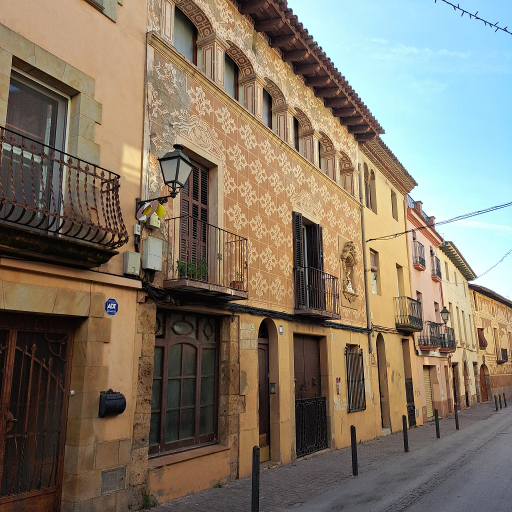 El ràfec té un voladís pronunciat, sostingut amb cabirons. El tractament exterior dels murs és arrebossat, amb un esgrafiat als pisos superiors que imita carreus amb motius repetits, angelets sobre les obertures i motius geomètrics a la galeria.