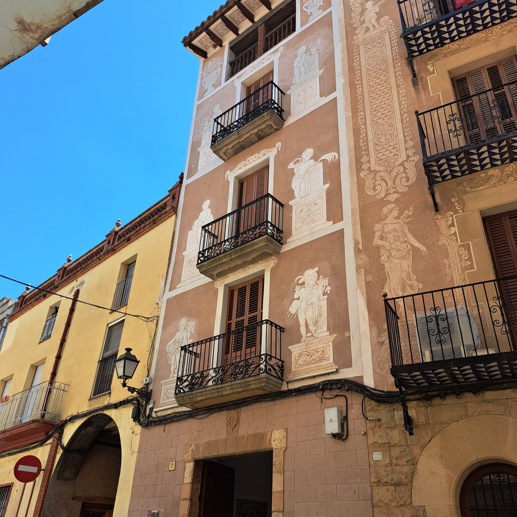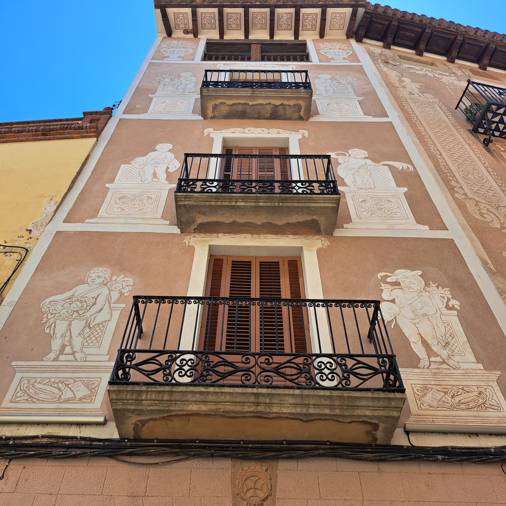 És un edifici entre mitgeres i de planta rectangular que s'estructura en una sola crugia. Consta de planta baixa, tres pisos i golfes i té la coberta a dos vessants amb el carener paral·lel a la façana. El frontis es composa segons un sol eix d'obertures d'arc pla arrebossat, excepte el portal que es troba emmarcat amb pedra i té una creu gravada sobre la clau procedent de l'antic convent dels Trinitaris. Els finestrals tenen sortida a balcons amb baranes de forja. A les golfes s'obre amb dos pòrtics separats per un pilar de fusta i estan delimitats amb baranes tornejades de fusta. El tractament exterior del mur és esgrafiat imitant carreus a la planta baixa, als pisos amb escenes bucòliques representades per angelets a cada costat dels finestrals. El ràfec està acabat amb cabirons, entre els que s'intercalen motius florals esgrafiats.