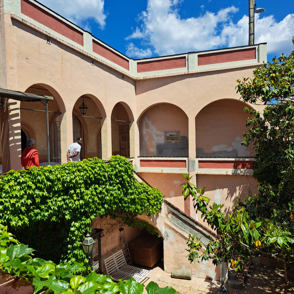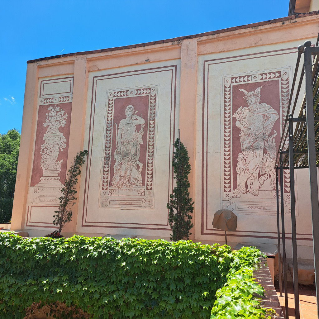 A la façana posterior s'obre amb una galeria porticada des d'on descendeix una escalinata fins al jardí. Les parets estan igualment decorades amb esgrafiats, on s'hi representen divinitats clàssiques. A l'interior s'hi conserva la distribució i els acabats originals.