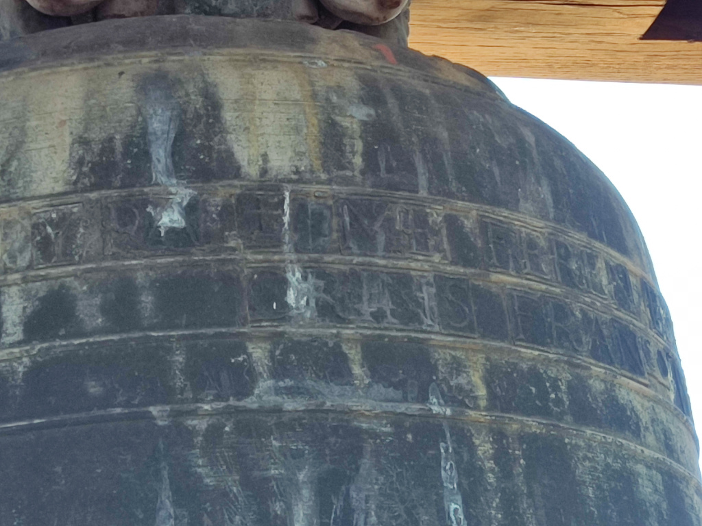 Es poden observar inscripcions epigràfiques en relleu: Bonabra.e Ysidro Pallès me feren en Barcelona Me feren essent rector al R.D. Jaume Planas, Obrer Franco. Bargalló y padrins Franco. Y Maria Font Fontanals. A més a més la campana també té decoracions com: Calze; imatge de la Mare de Déu del Roser; imatge possiblement de Sant Pere; orla amb motius vegetals i raïms; dues campanes.