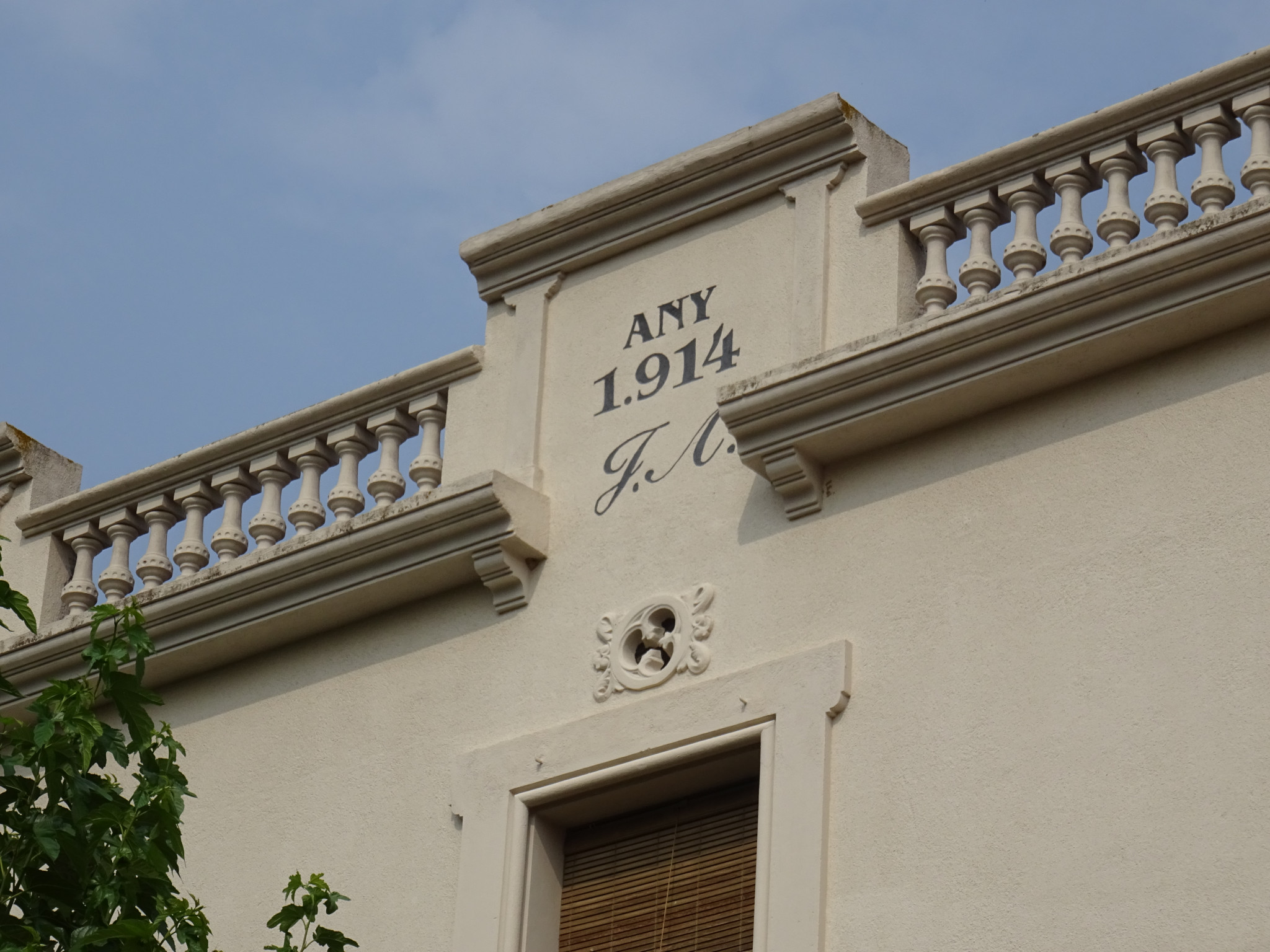 La façana principal incorpora de manera tímida alguns elements classicistes. Presenta una composició simètrica en base a tres eixos d'obertures. Al centre hi ha la porta d'entrada i dos finestrals. Al segon pis hi ha tres balcons amb baranes ventrudes. Les obertures de la façana tenen una faixa engaltada en les llindes (que sobresurt pels costats), brancals i ampits. A la part superior, sobre les obertures hi ha uns òculs de ventilació del sostremort. El coronament de la façana presenta tres cartel·les amb motllures classicistes sobre els eixos els eixos de les obertures, amb balustrades entre ells. A la cartel·la central hi consta l'any 1914.
