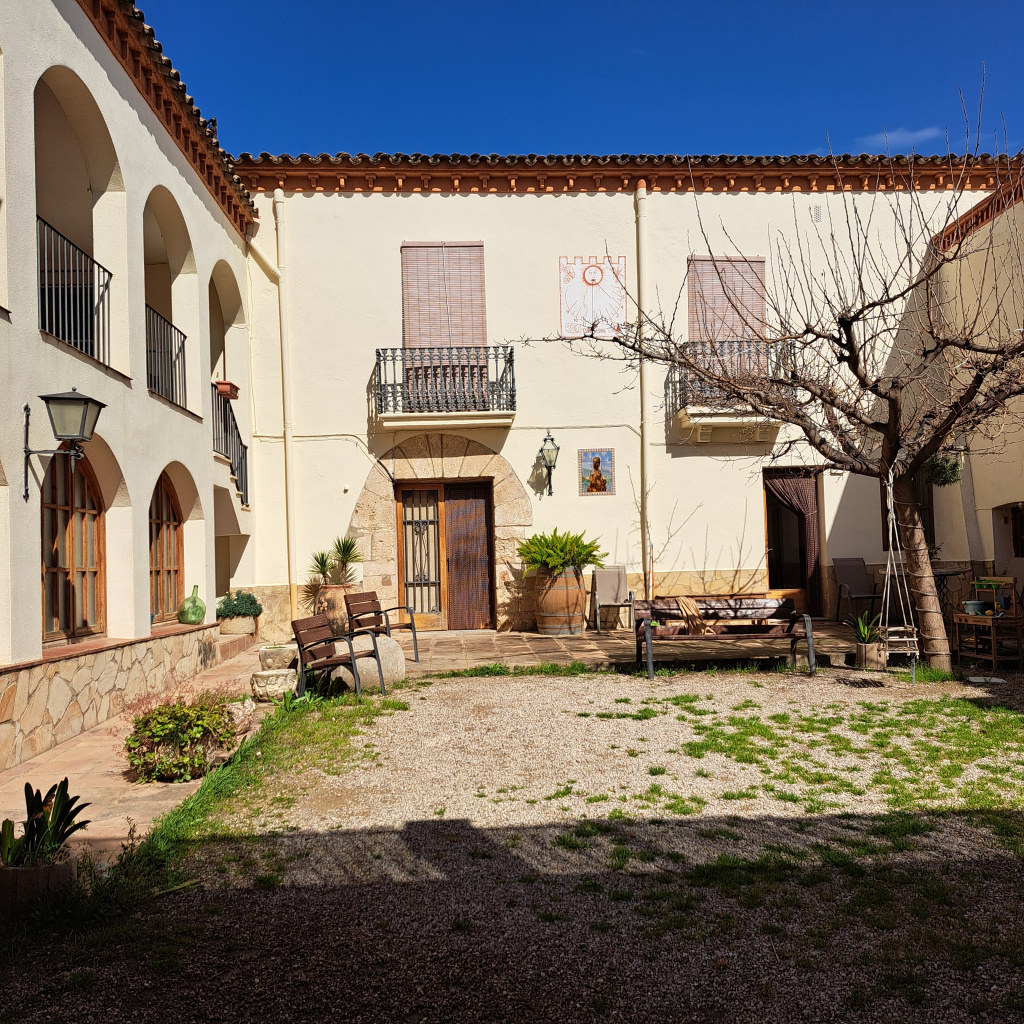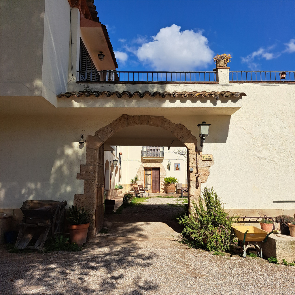 A banda i banda de la façana s'hi adossa de forma perpendicular un volum rectangular de construcció més recent, que formen un pati frontal. El de ponent s'hi obre amb pòrtics d'arc escarser arrebossat. A la part de migdia hi ha la portalada, d'arc escarser de pedra. Fora d'aquest recinte hi ha les restes d'una premsa de vi i una bassa-safareig.