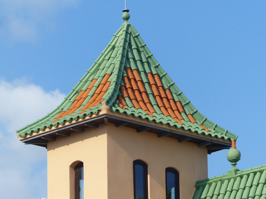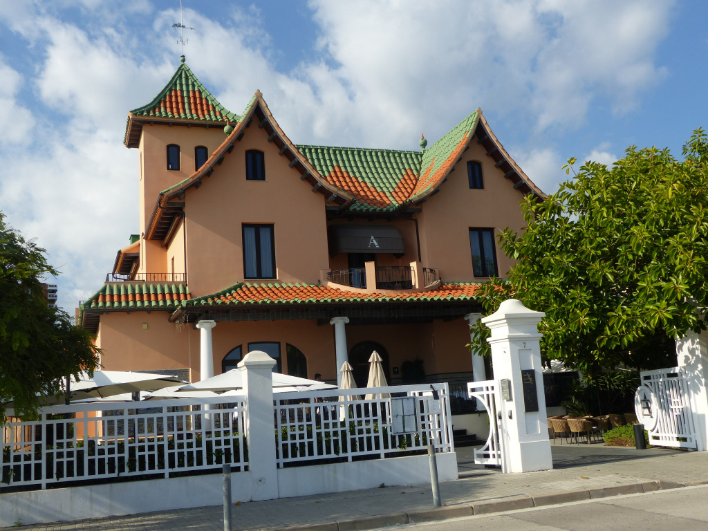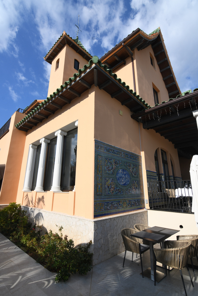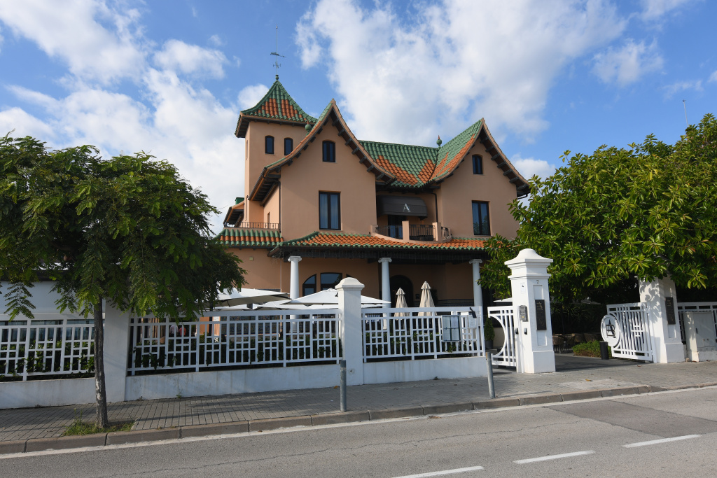 També sobresurt, a la façana septentrional, una tribuna, amb coberta de terrat pla. El porxo està sostinguda per quatre columnes d'estil jònic pintades de blanc que destaca de les tonalitats de la façana i de les teules. Una de les obertures de la façana de ponent també comparteix aquest tipus d'element ornamental. A la façana de ponent se succeeixen tres terrasses a l'alçada de la primera planta.