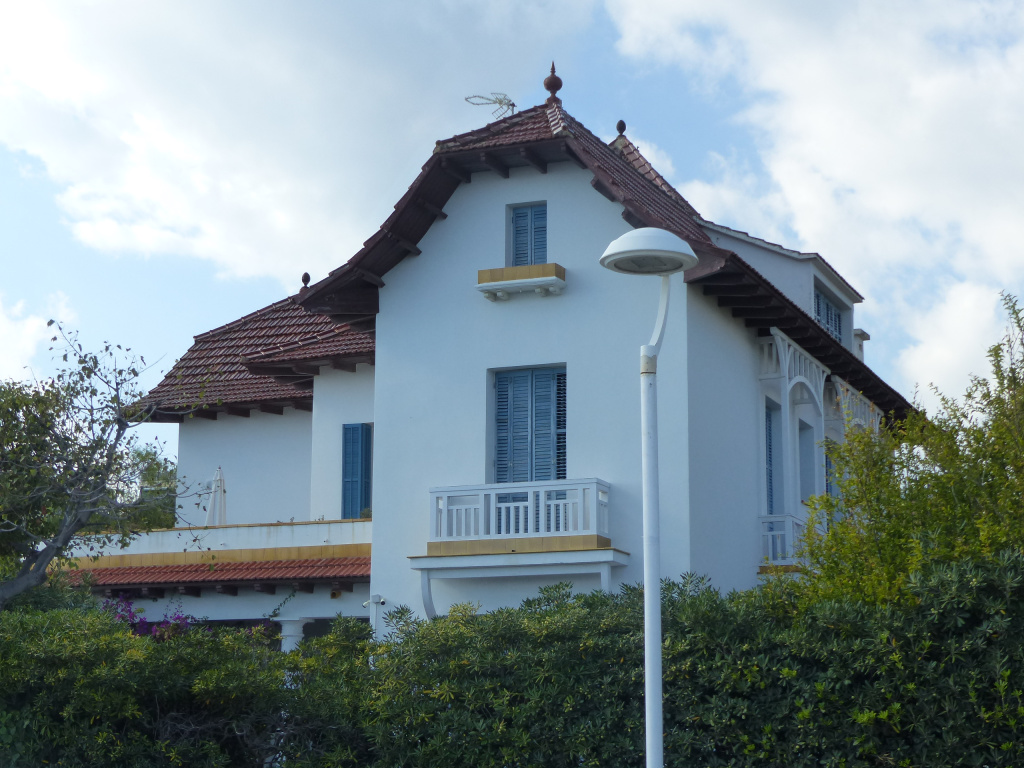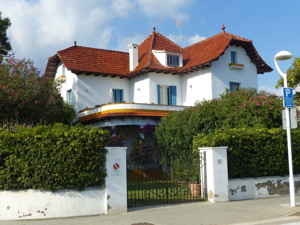 Totes les obertures són de llinda recta amb persianes de fusta de llibret, pintades de blau que contrasta amb el blanc de les façanes. Destaquen algunes finestres amb balcons amb barana de fusta pintada de blanc. Les de la planta superior tenen jardineres de rajols grocs.