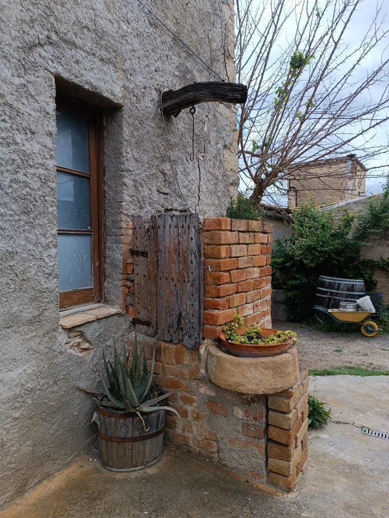 Els cossos laterals, de coberta a una vessant, presenten diferents obertures quadrangulars als dos nivells. Al cos esquerre hi ha una segona porta d’accés amb arc rebaixat a la planta baixa, i entre ambdues portes un banc d’obra adossat al mur. A l’extrem dret de la façana s'hi ha afegit un pou construït amb maons; segons ens informa la propietat actual, aquest pou no estaria connectat amb la capa freàtica del subsol sinó que recollia l’aigua de pluja a través d’un sistema de canalitzacions de la teulada.