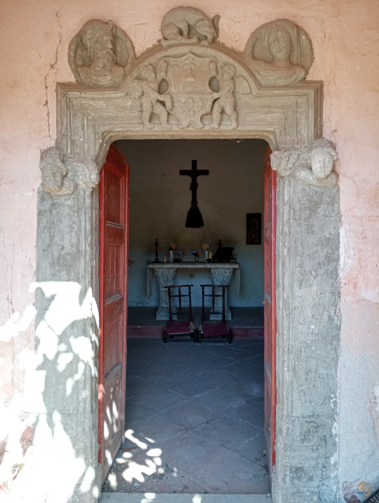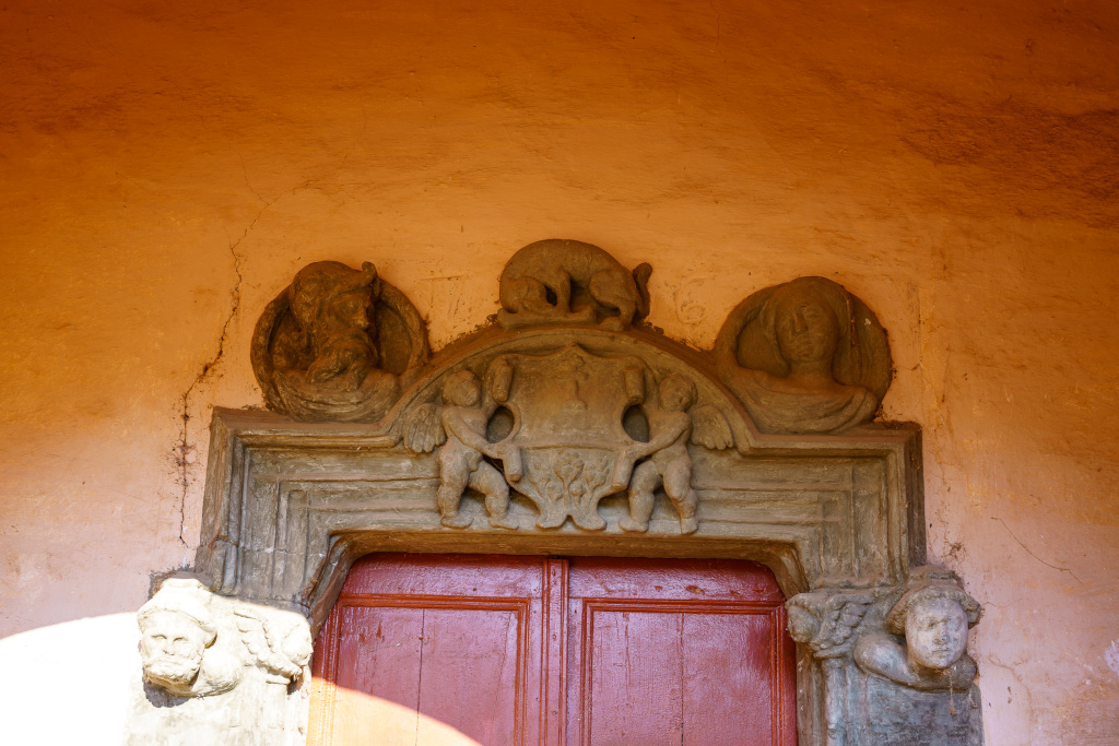A banda i banda de la llinda, es poden veure uns angelets encarats al buit de la porta, així com uns caps escultòrics d'un home amb gorra frígia i una dona mirant l'espectador.