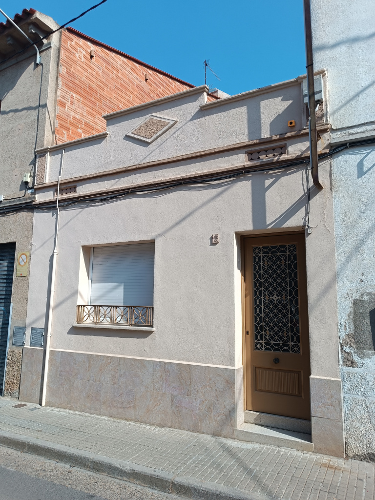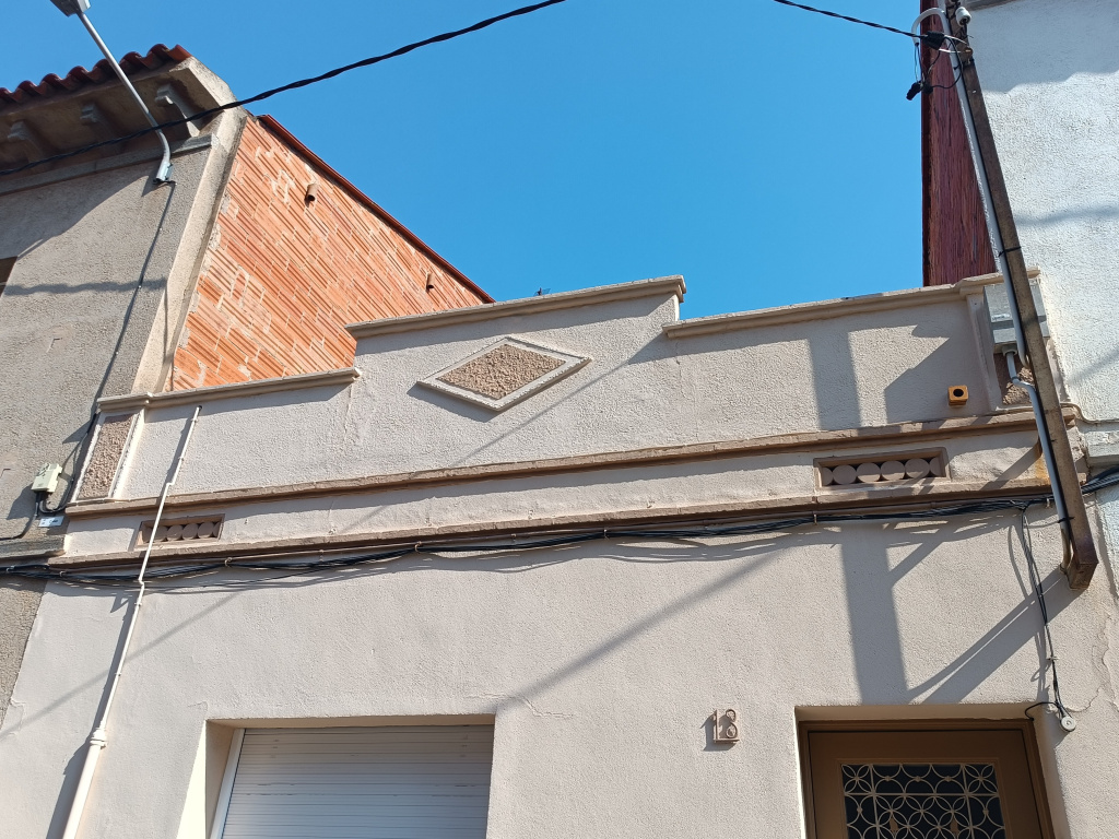 Habitatge entre mitgeres i de planta baixa única i en disposició rectangular. Les obertures de la façana són asimètriques. La porta d’accés, de fusta i amb detall de reixat, se situa a la dreta, i a l’esquerra s’hi obre una finestra rectangular amb barana metàl·lica. El coronament superior està definit per un perfil geomètric, amb una elevació central trapezoidal i una decoració romboidal en relleu que el centra visualment. Sota la línia de cornisa, que separa el cos principal del coronament, s’obren dues petites obertures decoratives, probablement amb funció de ventilació i de relleu estètic. El parament està arrebossat i pintat, amb un sòcol de revestiment ceràmic.