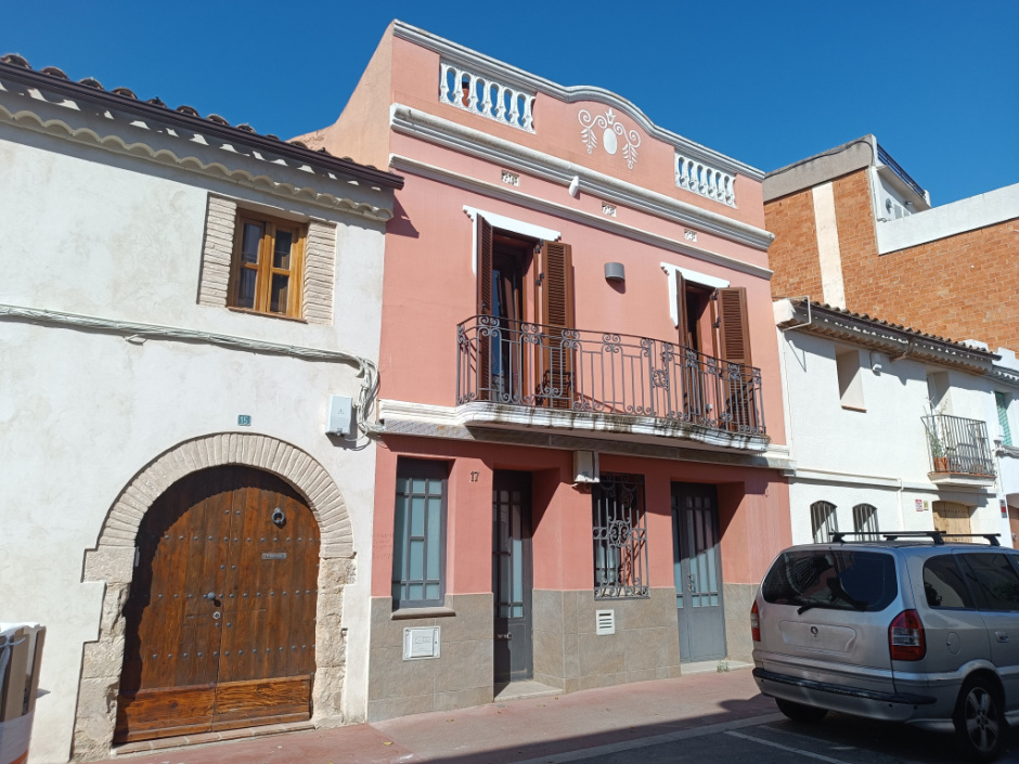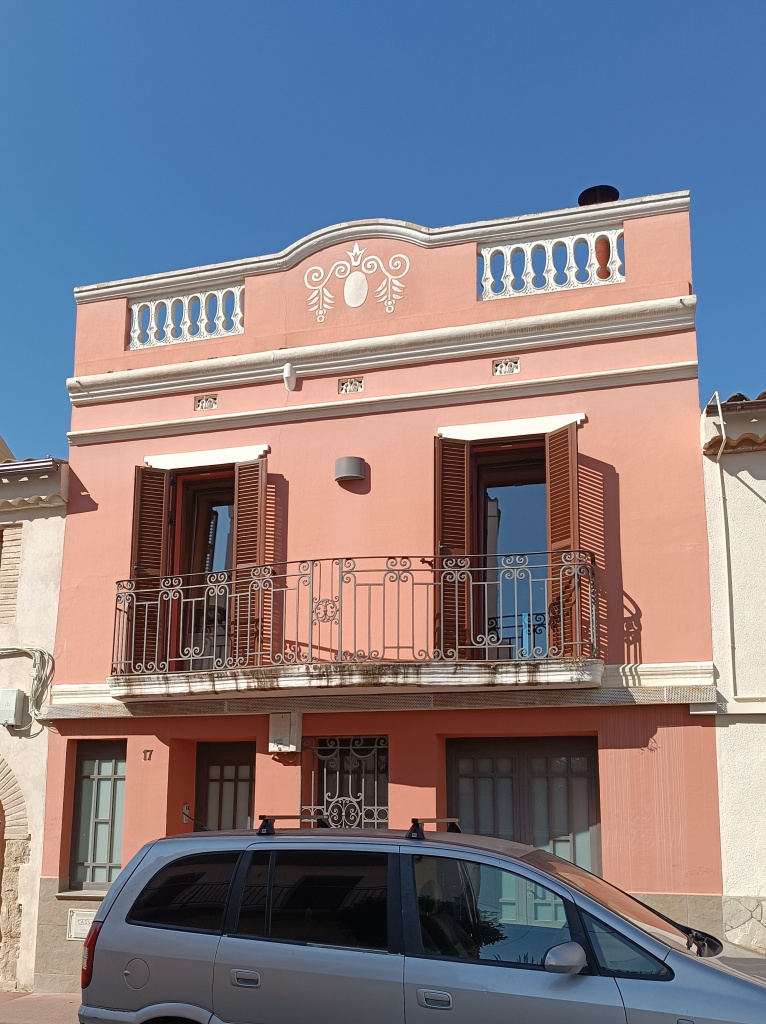 Edifici entre mitgeres, de planta rectangular, amb planta baixa i pis. La coberta és a dues aigües amb el carener paral·lel a la façana principal, resolta amb teula àrab i un coronament amb barana de balustrada i perfil ondulat al centre, separada del cos principal per una cornisa motllurada. El frontó presenta una decoració simètrica amb medalló central ovalat i motius vegetals estilitzats encapçalats per dues línies volutades. La façana està organitzada en dos eixos verticals, cadascun amb una porta d’accés a la planta baixa i una finestra lateral. Al pis superior, hi ha dues obertures amb balcó, unides per una balconada de forja amb base rodona al centre. Les motllures que emmarquen les obertures superiors destaquen sobre el parament arrebossat i pintat en color rosat, amb sòcol inferior.