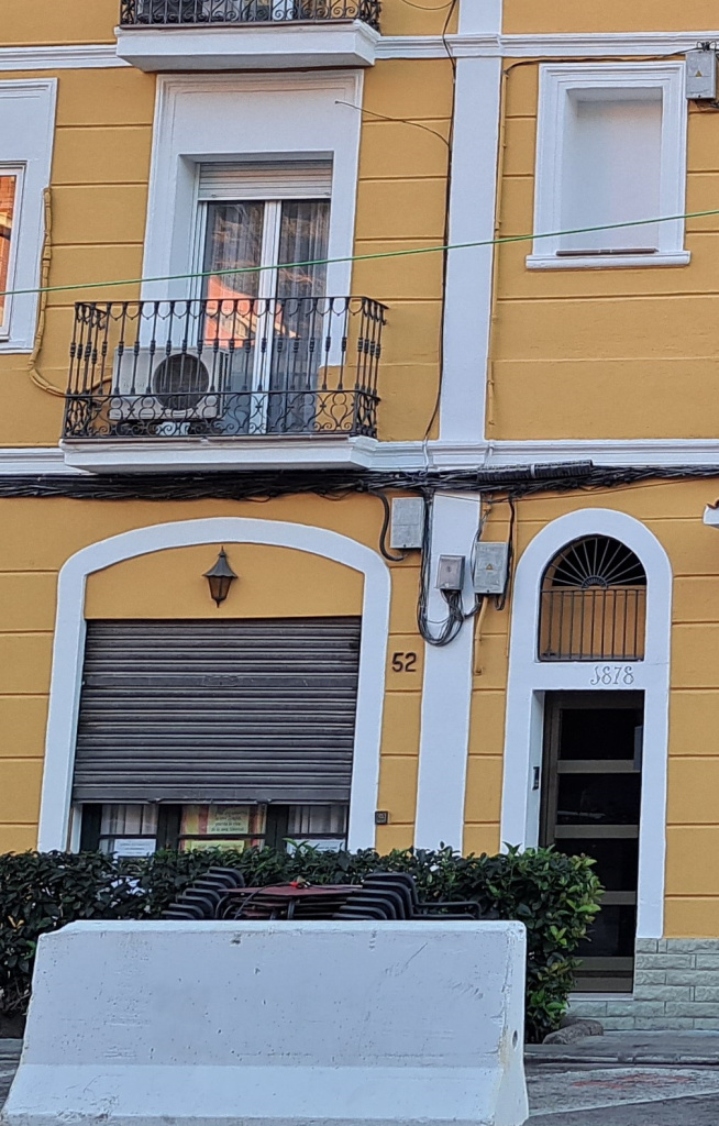 Els buits estan tots emmarcats i emmotllurats al primer i segon pis. En planta baixa, només emmarcats. Destaquen els balcons, amb peanyes protegides per baranes amb brèndoles de forja decorades, amb més ornamentació en la planta primera que en la segona. L'antiga porta d'accés, de traça vertical i finestra corba que està traçada per sobre de la porta, presenta la data de la construcció: 1878.