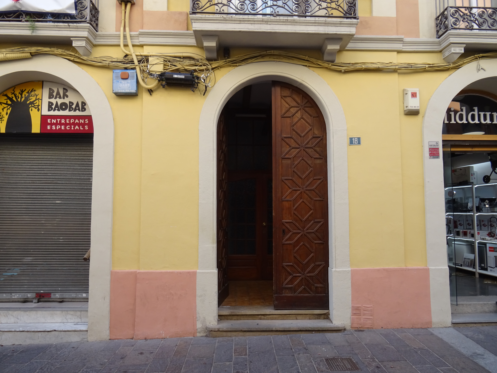 A la planta baixa hi ha tres grans portals, el central d’accés a l'edifici i els laterals als locals comercials. Als pisos superiors hi trobem tres balcons per planta. Els del primer pis es subjecten sobre mènsules. Al segon pis el balcó central també té mènsules, i els laterals són en forma de balconeres. Unes faixes horitzontals similars a les verticals, també de dos colors, decoren la part superior de les cornises que separen els pisos. El coronament de l'edifici es resol mitjançant un fris i cornisa d'estil classicista.