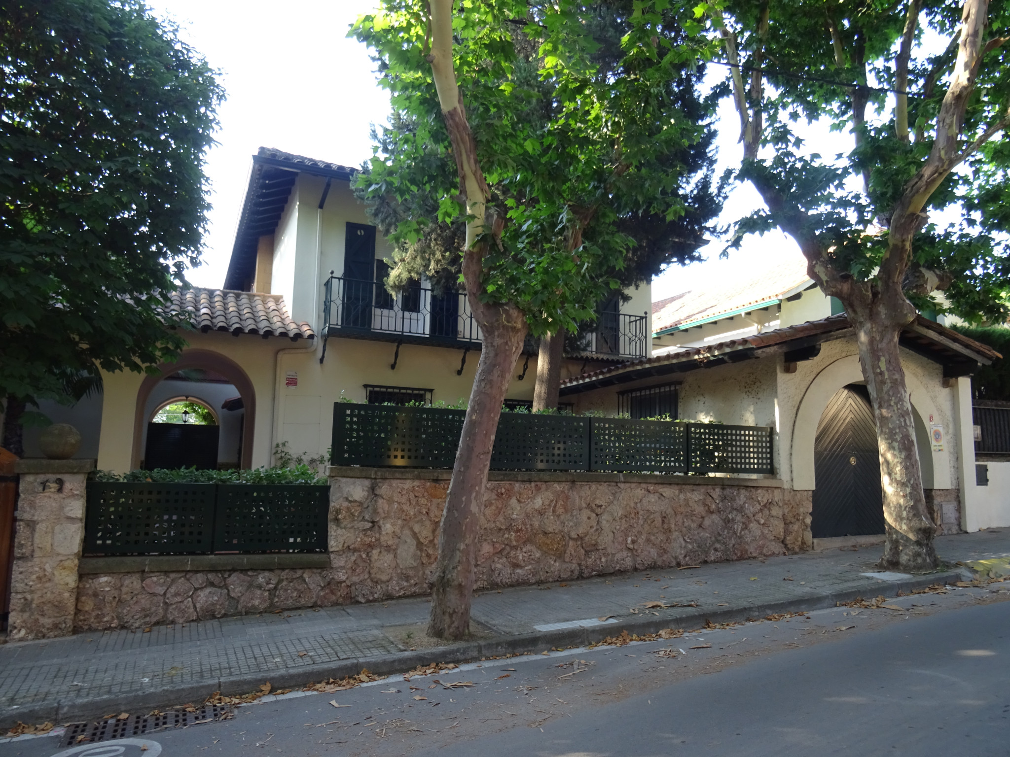El xalet de l’esquerra a la planta baixa de la façana principal té dos finestrals i, a la planta primera, dos finestrals més en el mateix eix vertical.