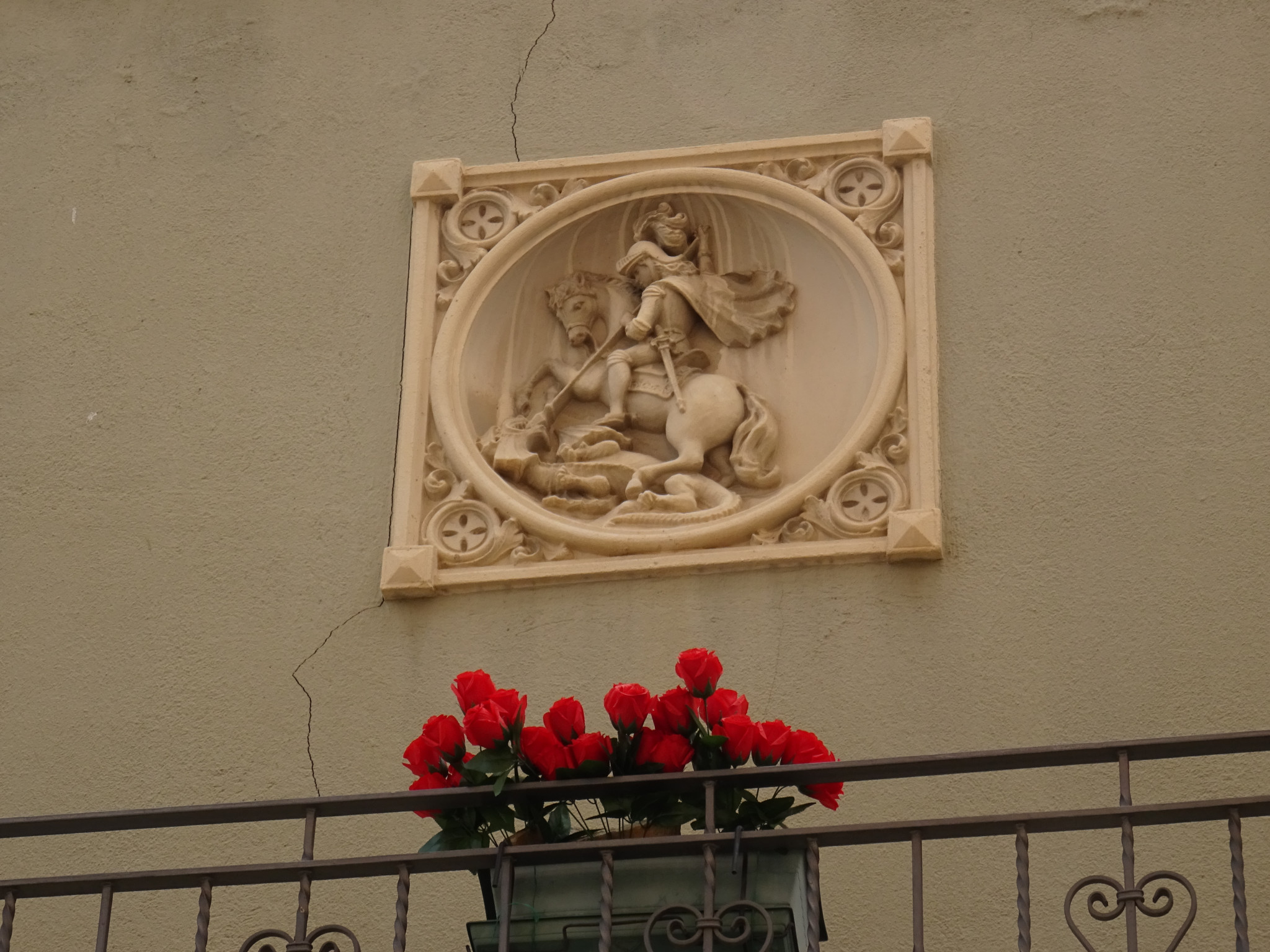 La façana principal (al carrer Viñolas) presenta una composició no simètrica però ben ordenada. A la planta baixa hi ha un doble finestral dividit amb una columneta amb capitell jònic, a l'esquerra. El portal queda desplaçat del centre, i té una finestra a la seva dreta. Aquesta façana es caracteritza perquè totes les obertures presenten una motllura de contorns arrodonits que les emmarca; les de la planta inferior inclouen amb una falsa clau central ornamentada amb garlandes florals al damunt. A la primera planta destaca un balcó corregut que ocupa tota la façana. S'hi s'accedeix per dues obertures amb llinda d'arc carpanell decorada amb una petxina al centre. Entre les obertures hi ha un relleu escultòric de Sant Jordi.