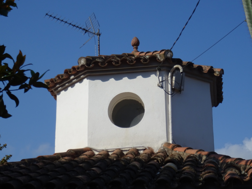 De la teulada en sobresurt un cos prismàtic de planta octogonal, amb òculs en diversos costats per donar llum a l'interior de l'habitatge. Conté un ràfec motllurat. La teulada és a diversos vessants, amb teula àrab i coronada amb una pinya ceràmica.