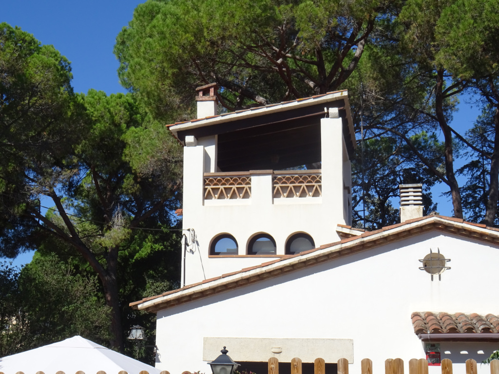 A la part posterior de la casa sobresurt una torre amb una galeria de tres finestres que presenten ampit motllurat. A la part superior hi ha un terrat tancat amb una balustrada feta de peces de ceràmica entre pilastres i pilastrons. Les pilastres suporten una teulada de teula plana sobre arquitraus de fusta.