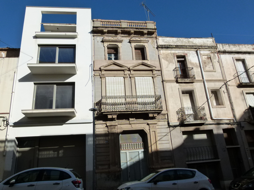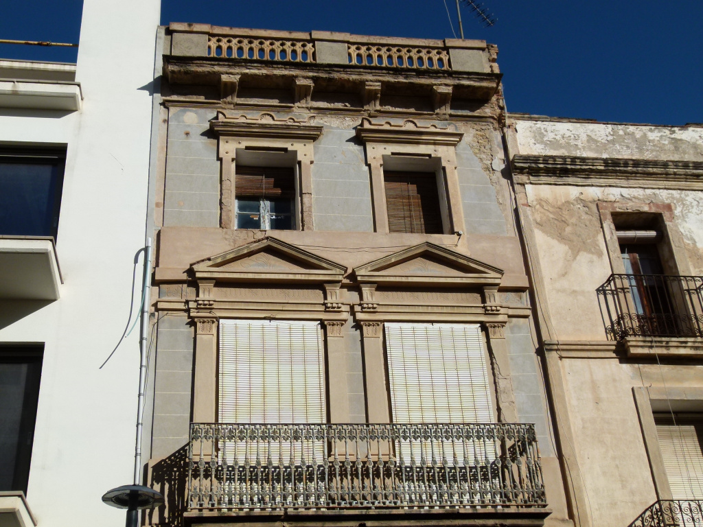 Aquesta decoració es repeteix en les obertures del primer pis, on una balconera sustentada per mènsules es decora amb barana de ferro de fossa. Sobre les obertures es disposen simulacions de frontons clàssics.