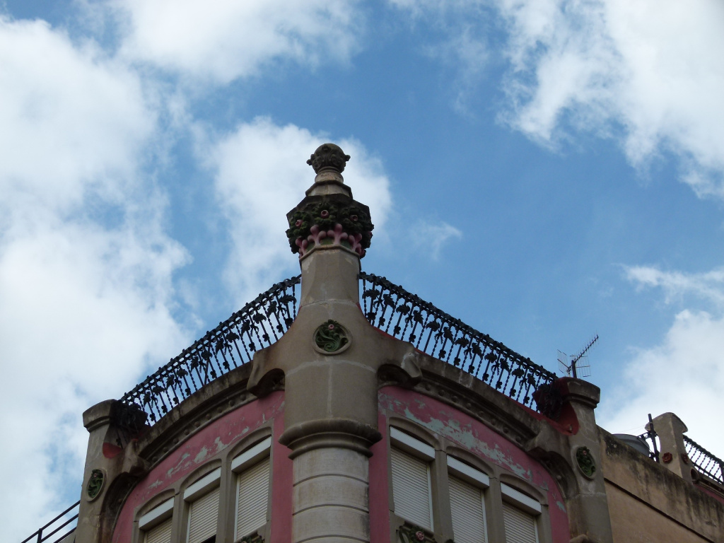 Les formes sinuoses són una constant en tot l’edifici: a les baranes, a les motllures que emmarquen les obertures i als relleus decoratius sota les finestres. També destaca la cromaticitat de l’edifici, amb un arrebossat general de color fúcsia i detalls ornamentals en verd o fúcsia, que reforcen la unitat estètica del conjunt.