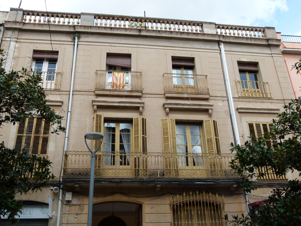 A la primera planta destaca la balconera amb llosana de pedra sustentada per mènsules, baranes de ferro, i obertures decorades amb frisos d’estètica classicista. Al segon pis, els dos balcons són de poca volada i per sobre es situa la balustrada del terrat que culmina la façana.