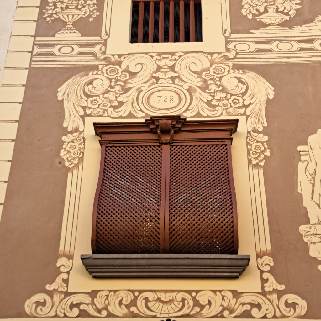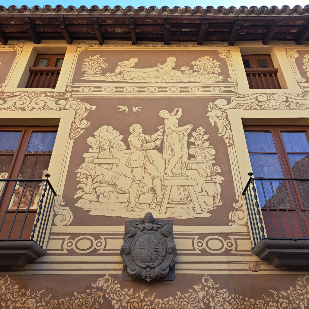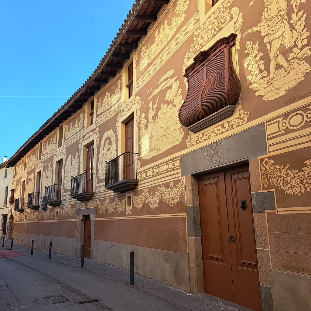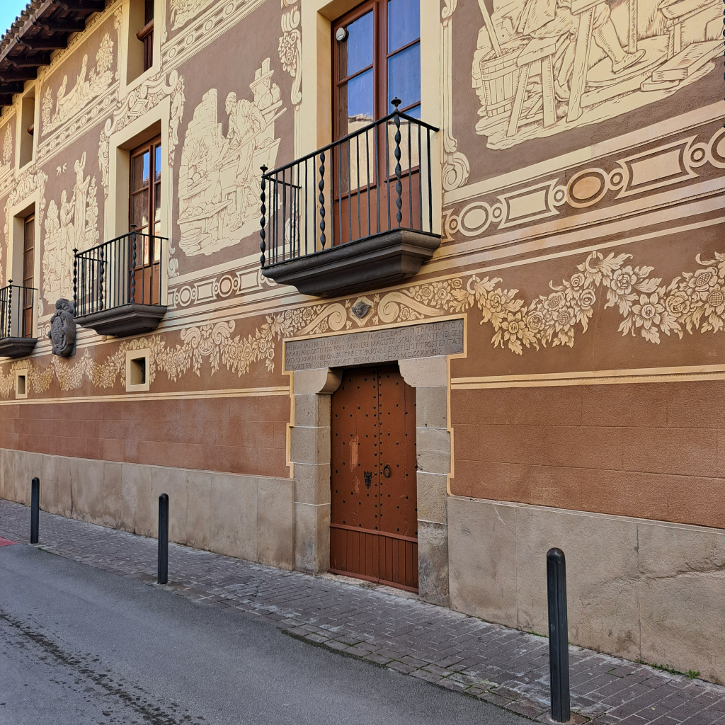 El ràfec està acabat amb cabirons i té un voladís pronunciat. El tractament exterior del mur és esgrafiat, a la planta baixa amb una garlanda que enllaça les obertures i als pisos superiors escenes d'oficis tradicionals entre les obertures entre sanefes i decoració vegetal. Els oficis representats són el de sastre, filadora, escultor, forner, terrisser, pastor i músic. Les escenes de les golfes les representen angelets.