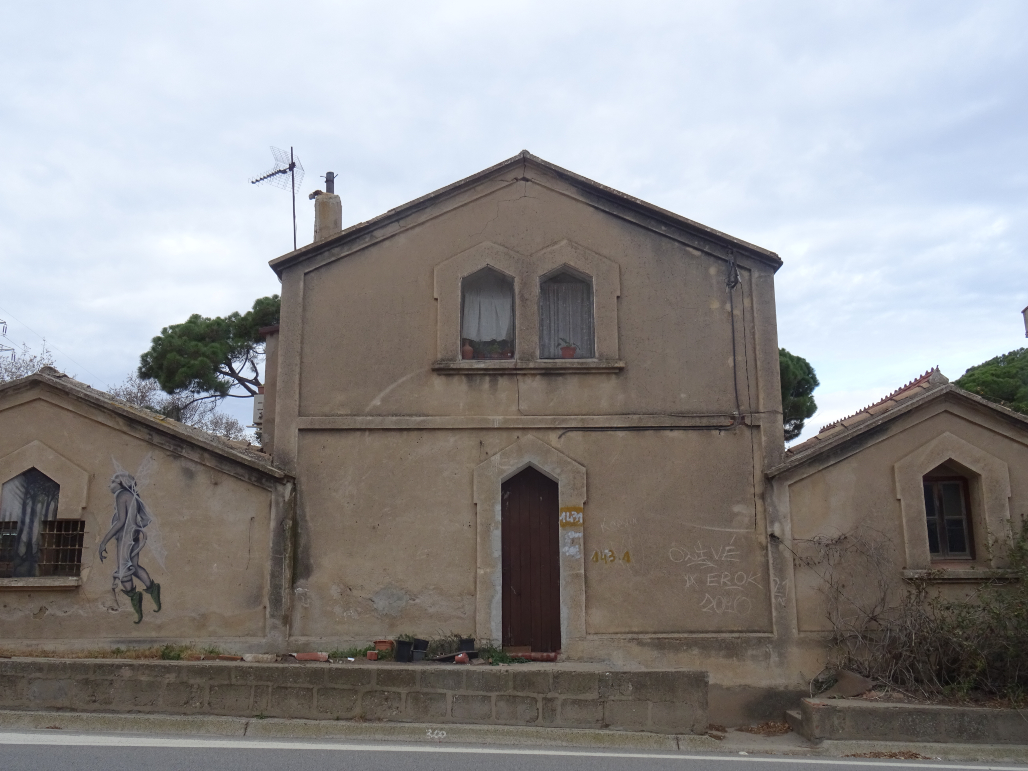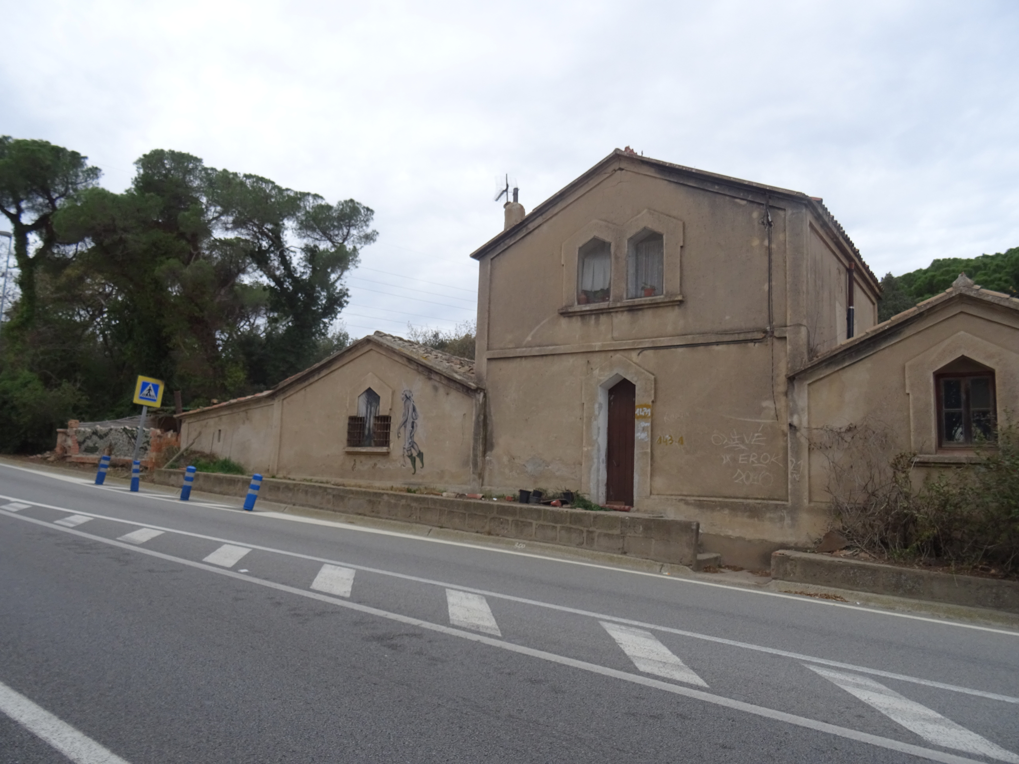 Edifici amb signes evidents d'abandó, vandalisme i ocupació, amb despreniments en l'arrebossat i la fusteria de les obertures feta malbé.