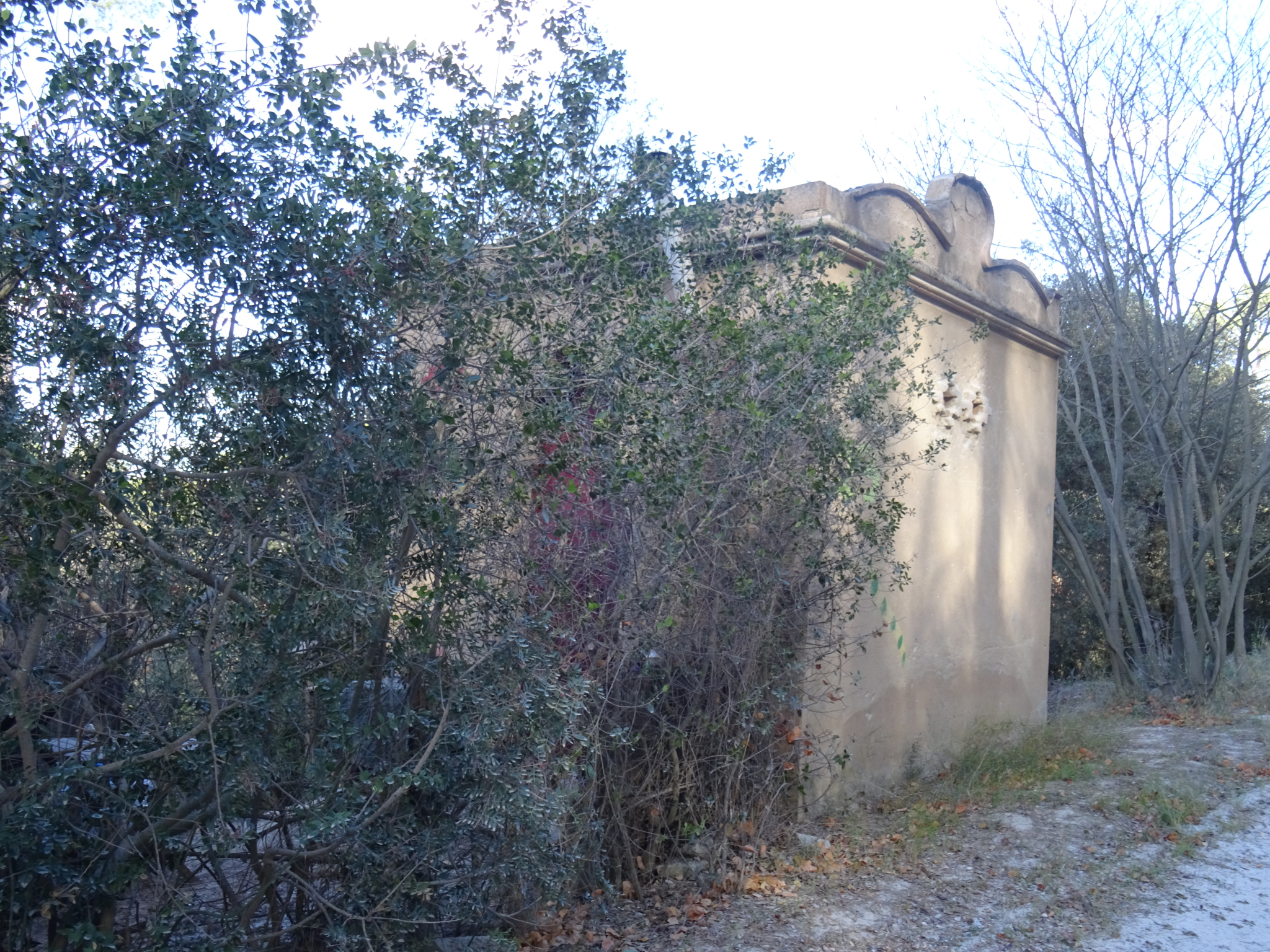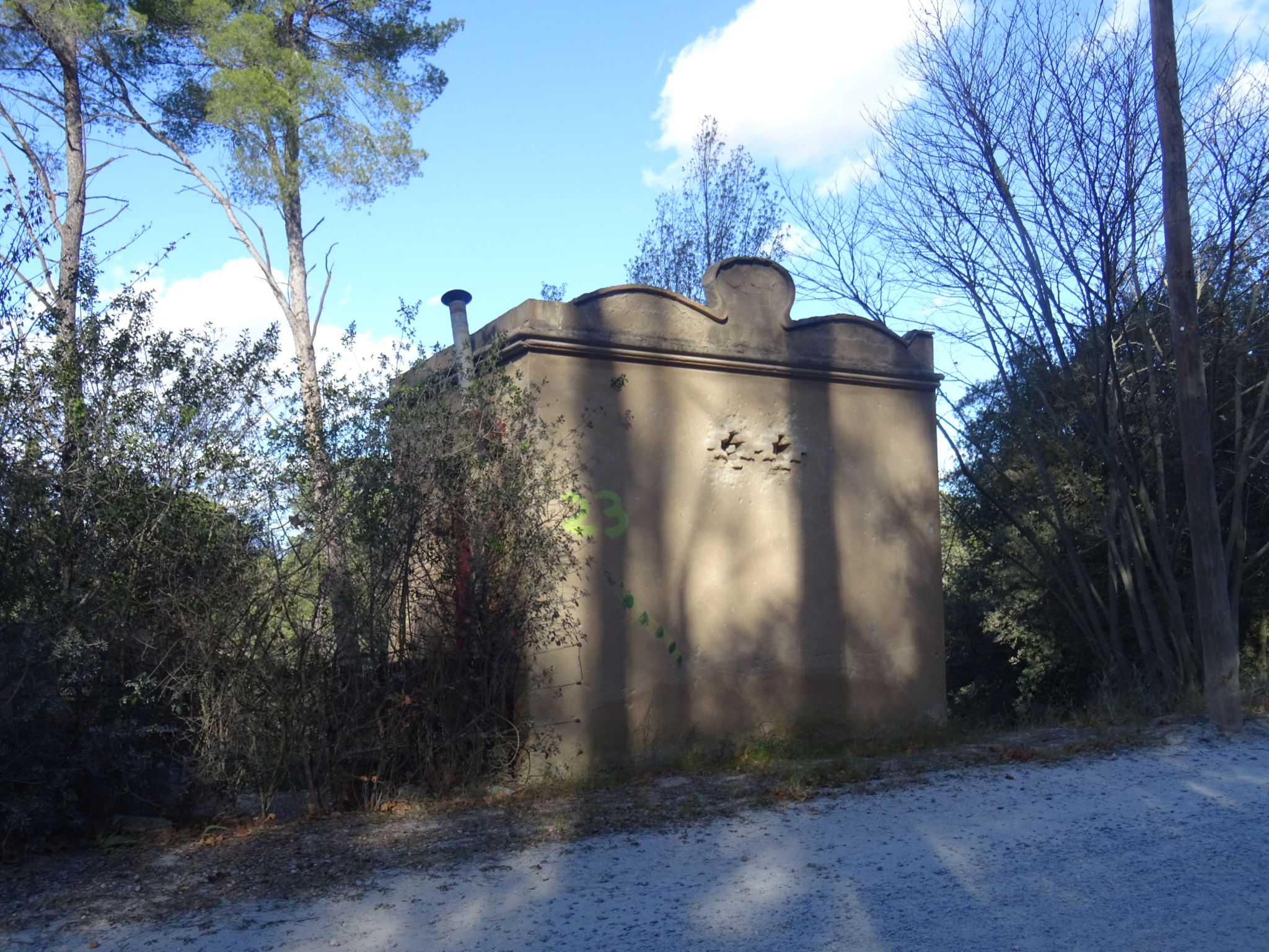 És un edifici de planta quadrada. La porta d'entrada presenta a la part superior un retall campaniforme i, a cada costat, una obertura emmarcada amb maó, en forma de creu. A la façana lateral, que és paral·lela al camí, s'hi observen dues obertures de la mateixa tipologia però en aquest cas es troben centrades al mur. El coronament d'aquesta façana és en forma de pinyó ondulat.