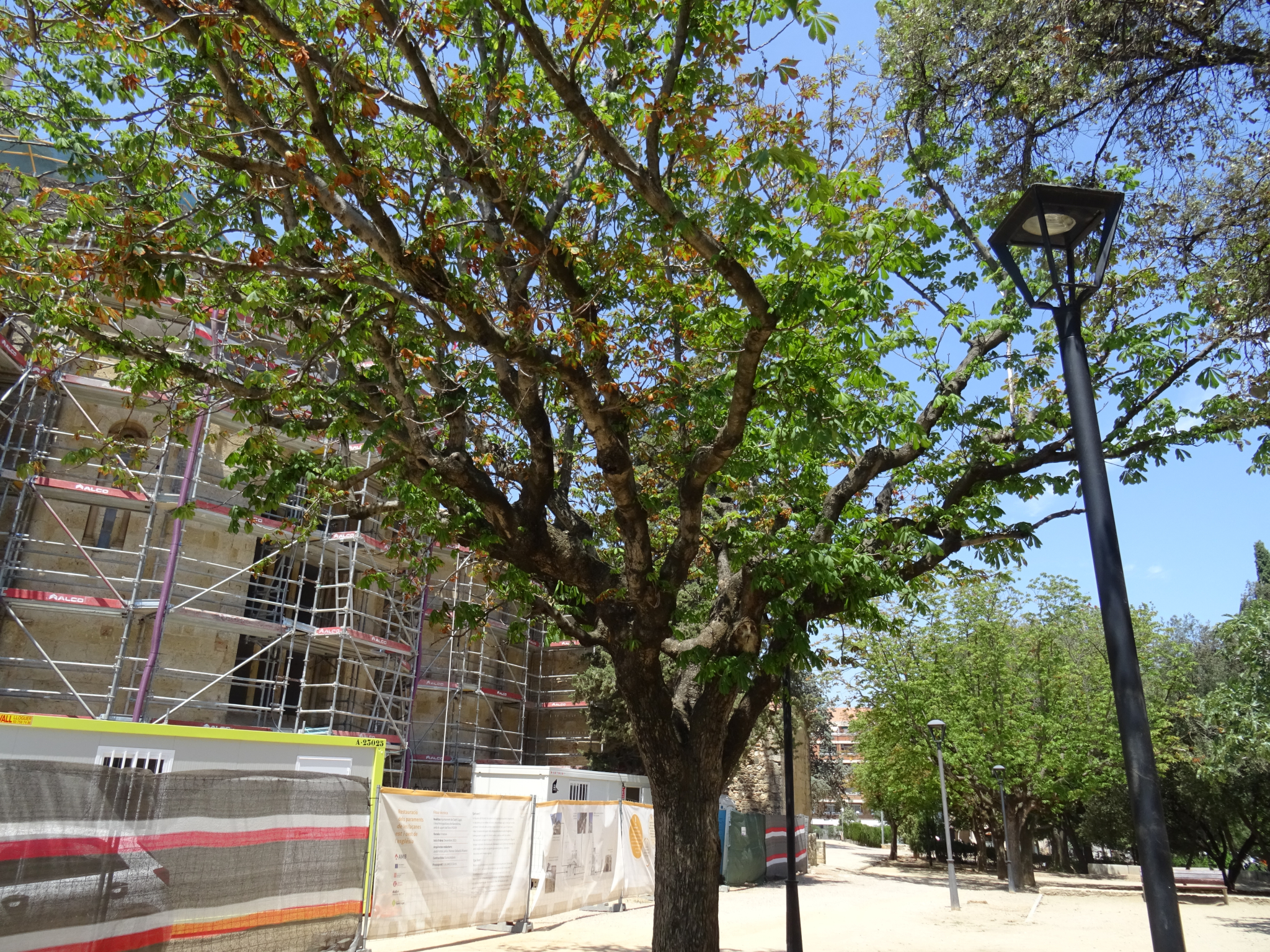 L’Aesculus hippocastanum és de la família de les fagàcies, originari de la zona dels Balcans. El nom comú en català és castanyer bord o castanyer d'Índia. Aesculus és el nom llatí d’alzina i hippocastanum vol dir castanya de cavall. L’arbre pot fer entre els 15 i els 30 metres d’alçada, la seva escorça és marró grisós i la capçada és arrodonida. Les fulles són de color verd fosc, peciolades, on els pecíols fan entre els 5,5 i els 18,5 centímetres, i tenen entre 5 i 7 folíols obovats que fan entre 9,5 i 33 centímetres.