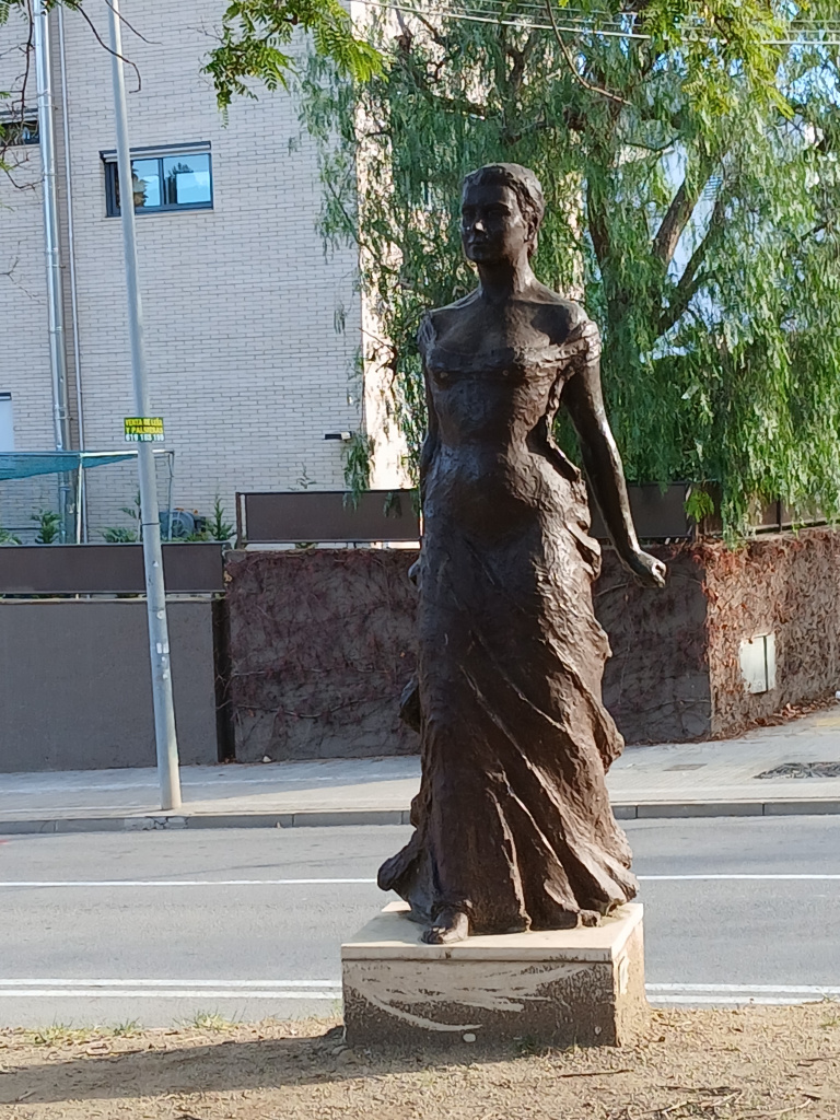 Escultura realista en bronze d’una figura femenina a mida real, que porta un vestit fins als peus i els cabells recollits. Està dreta en una posició de moviment cap al front, amb la cama dreta avançada, els braços estirats enrere i els punys tancats. Presenta unes mides d'1,59 m d’alçada, 0,60 m d’amplada i 0,45 m de fons.