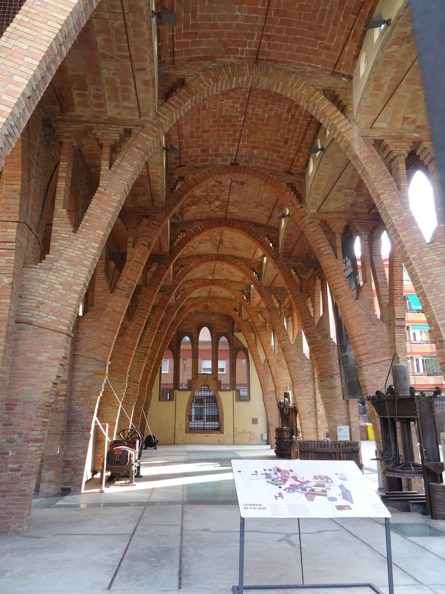 La nau principal de l’edifici, de planta rectangular, és formada per arcs parabòlics fets de maó vist i amb cobertes de volta catalana de maó de pla, amb forma de volta de mocador. Els arcs parabòlics es recolzen en els carcanyols, alleugerits per pilarets, que travessen les voltes inferiors. Les voltes també fan de base per a les tines de superfície, que es disposen en dues files a cada banda de la nau. Aquest espai estava destinat als cups de vi. La coberta de l’edifici és formada per voltes de maó de pla semblants a closques d’ou. Són fetes amb tres capes de rajola i contenen obertures entre els diferents nivells. La façana de la capçalera presenta un sòcol de pedra i, al damunt, una sèrie d'arc allargassats, confeccionats amb maó, que es disposen seguint la curvatura dels arcs parabòlics interiors.