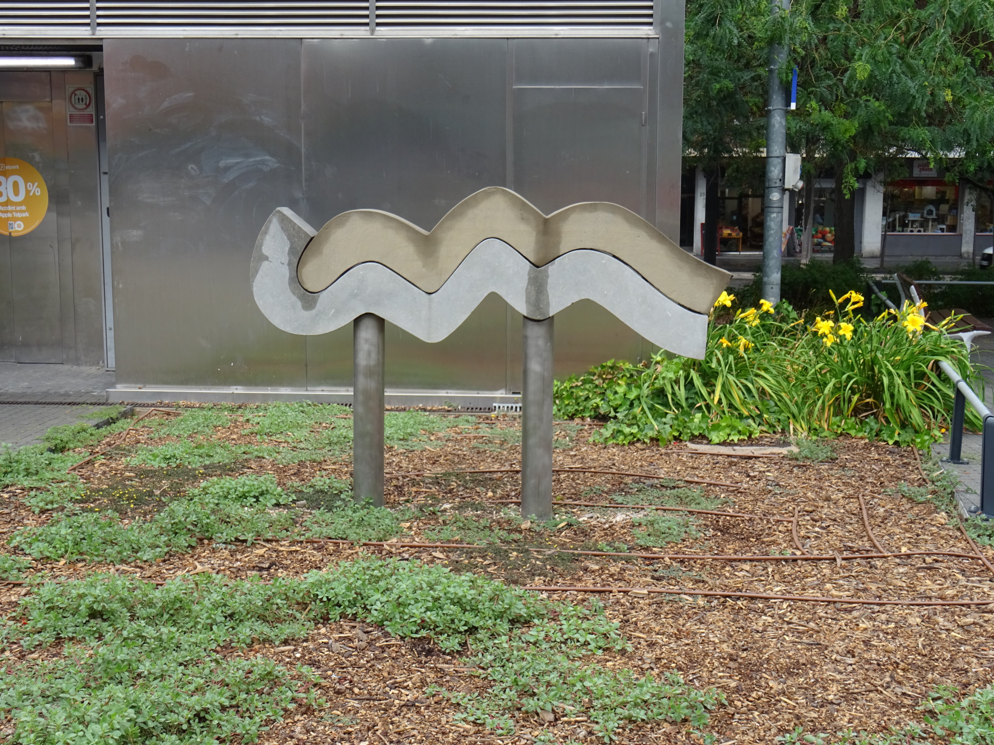 Escultura dedicada al Club Muntanyenc Sant Cugat que recorda les inicials del nom de l'entitat (CM), tot fent forma de perfil de muntanya. Està formada per dues peces sinuoses que encaixen i que són de dos colors diferents, amb la intenció de simular unes muntanyes nevades. Aquests dos colors s'han obtingut a partir dels dos tipus de pedra emprats: pedra de Sant Vicenç de Castellet i pedra sorrenca. El conjunt se sustenta damunt de dues columnetes metàl·liques.