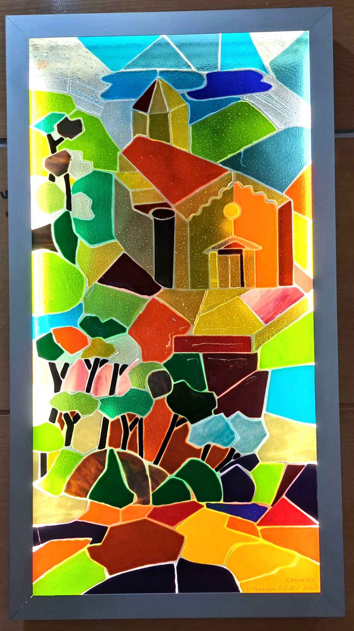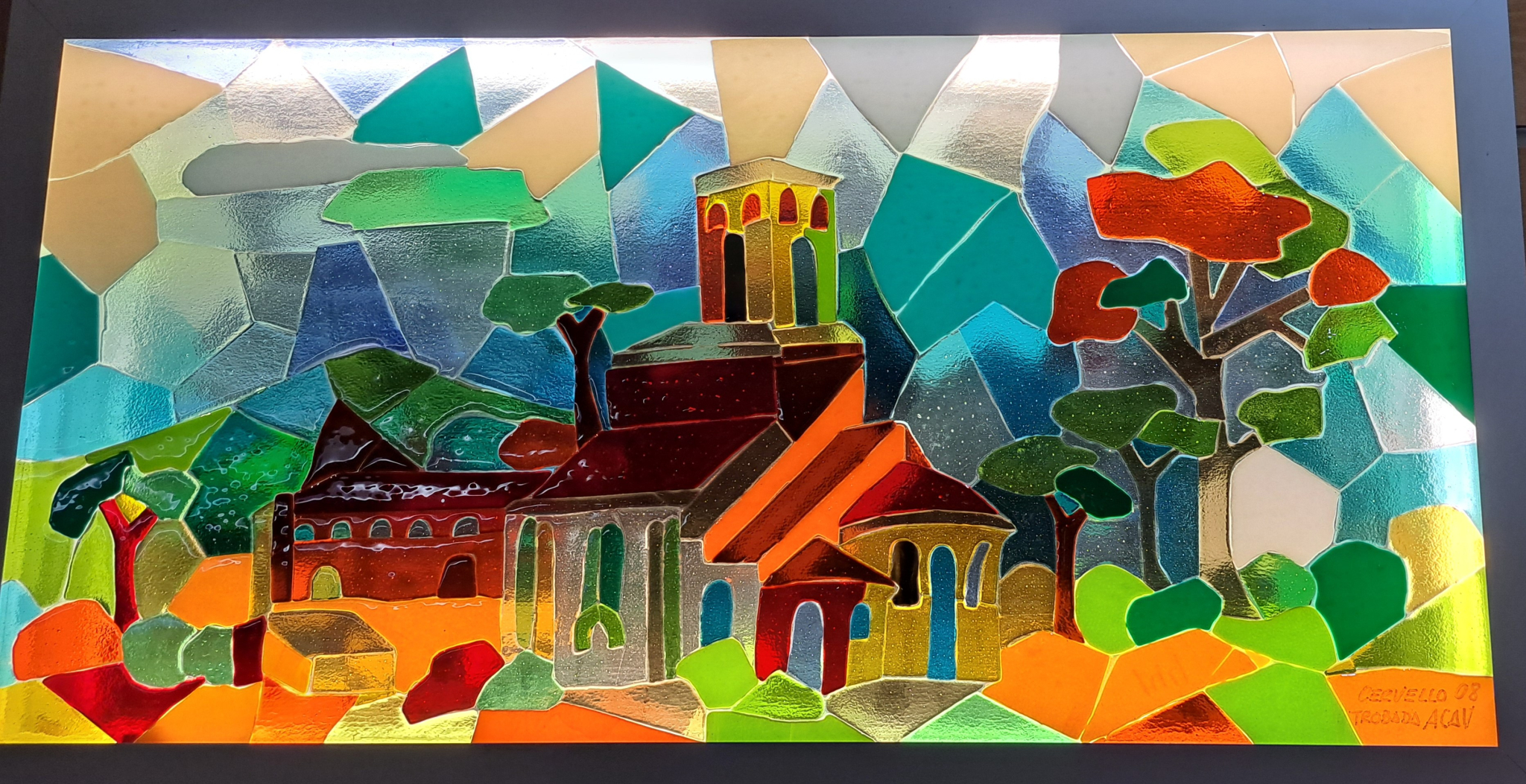 Destaquen tres obres que es troben exposades permanentment al saló de plens de l'Ajuntament de Cervelló. Dues estan fetes amb trencadís de vidre, representen l'església de Santa Maria de Cervelló i el monestir de Sant Ponç de Corbera.