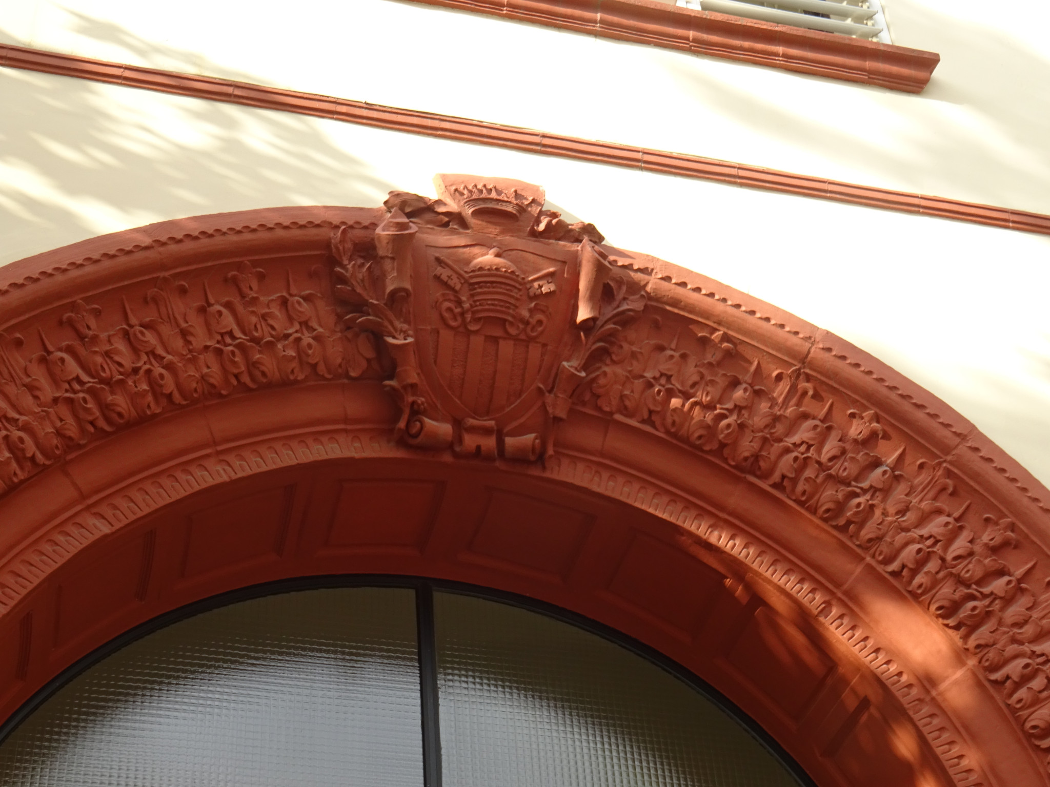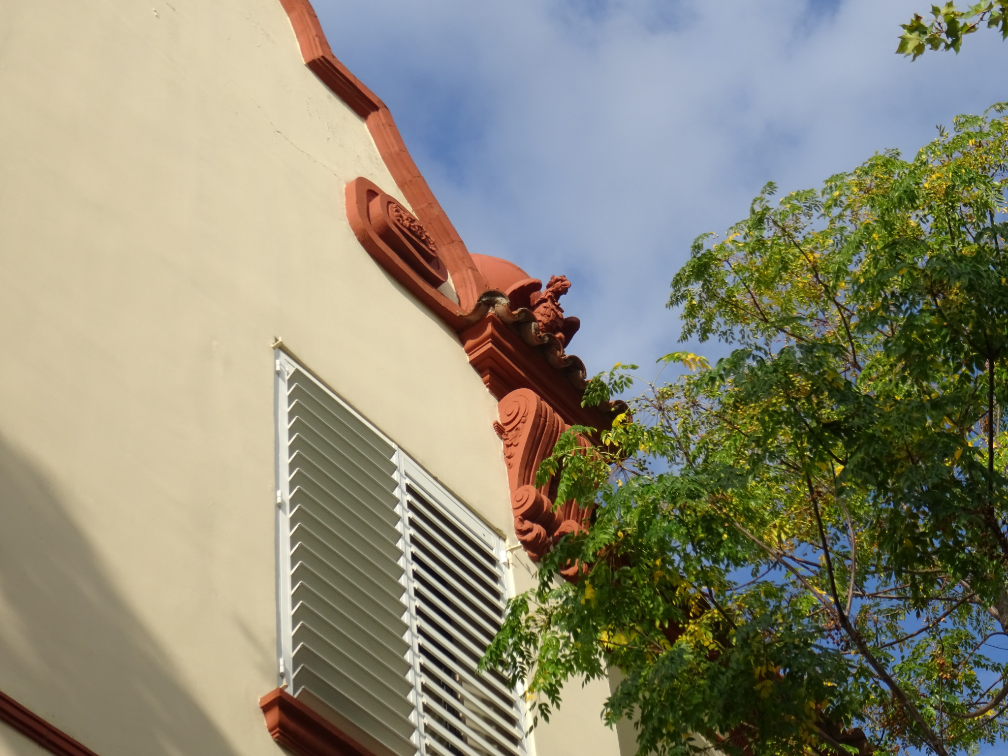 El parament arrenca sobre un sòcol de carreuons de granet, arrebossat i de color clar. En destaquen l'ornamentació ceràmica crua de to vermellós ataronjat al portal d'accés, les dues línies d'imposta, els ampits de les finestres de la planta primera, els respiralls de les golfes, el contorn de l'òcul central i el coronament de l'edifici, inclòs el perfil curvilini central amb els seus elements ornamentals, tant les volutes com les escultures d'animals.