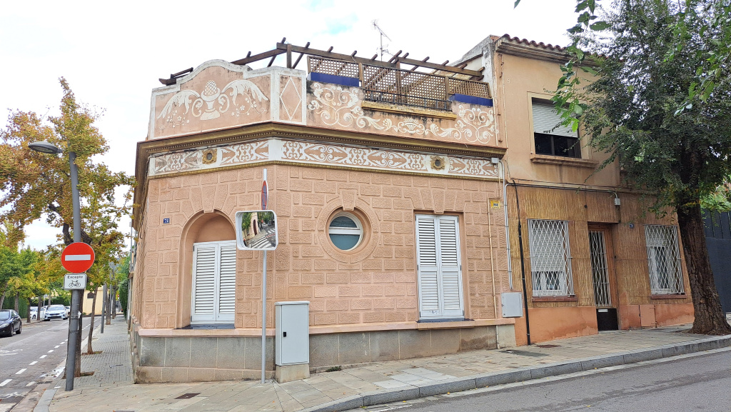 Per sobre del xamfrà, la façana queda rematada per un frontó ondulat que forma part de la barana d'obra, que protegeix i amaga la coberta de terrat, decorada a la seva superfície per esgrafiats de motius vegetals i geomètrics. Tota la façana està arrebossada i pintada en color crema rosat, amb un sòcol a la part baixa emmarcat per una motllura. El pany principal de façana presenta una decoració en relleu que simula una construcció amb grans carreus i dovelles. La decoració esgrafiada, en color blanc, destaca sobre l'acabat en color rosat de l'edifici.