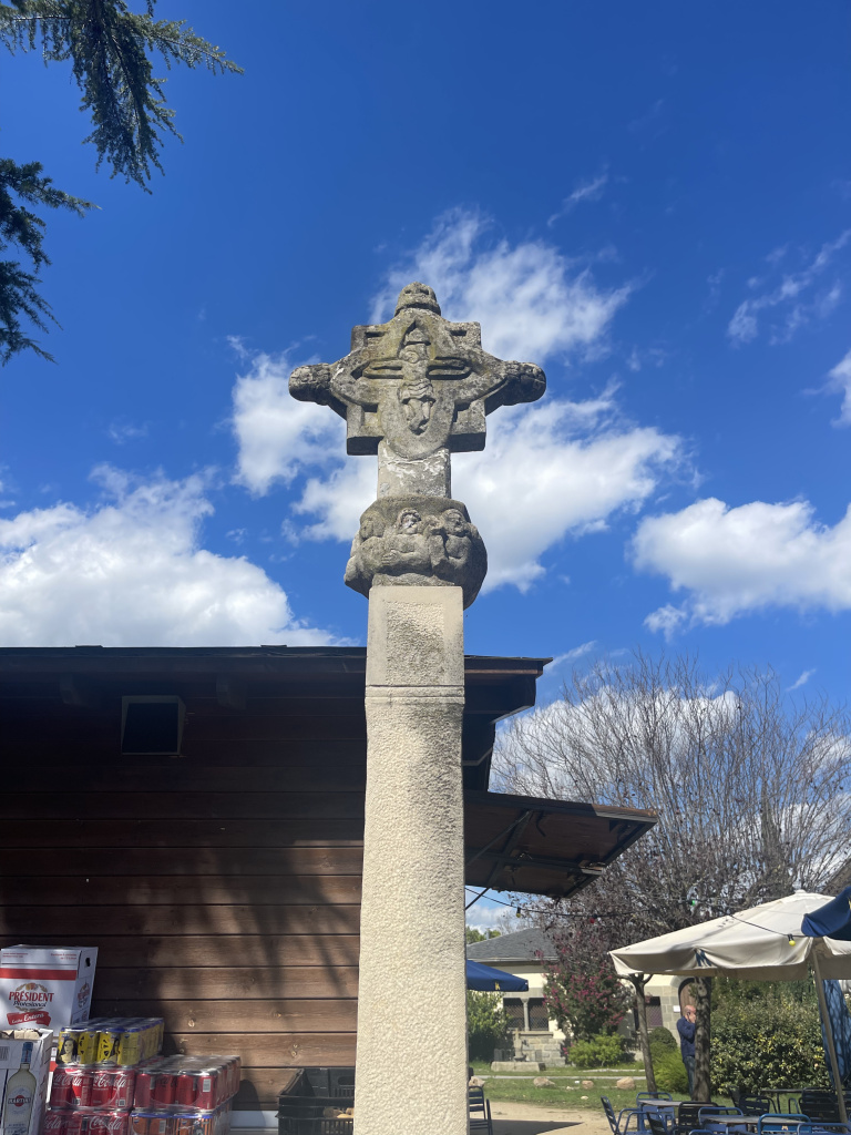 Creu situada davant la nova església de Vilalba Sasserra, al peu de la carretera. És una creu de terme de pedra, sobre una base de planta hexagonal i un fust de secció quadrada que són d'època contemporània. La part superior de la creu té una base amb una sanefa amb personatges entrellaçats entre ells i al damunt la creu de pedra pròpiament dita amb un quadrat sobreposat i la creu amb la crucifixió de Jesús representada. Sembla de factoria senzilla i amb les puntes de la creu amb uns acabats arrodonits degut a l'erosió.