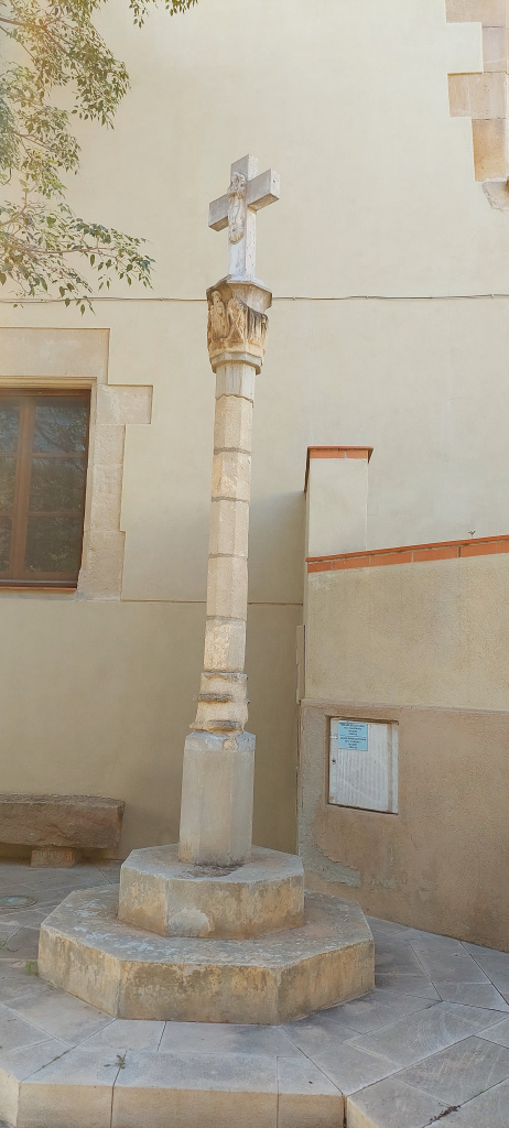 A la part superior, una creu que substitueix la desapareguda creu original, amb una imatge de Marededeu còpia de l’existent a la façana de l’església (que es pensa estava a la creu original), completa el conjunt.