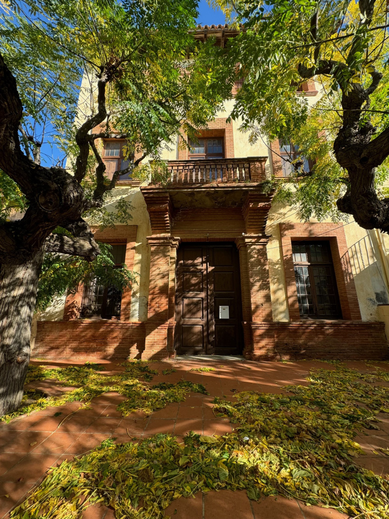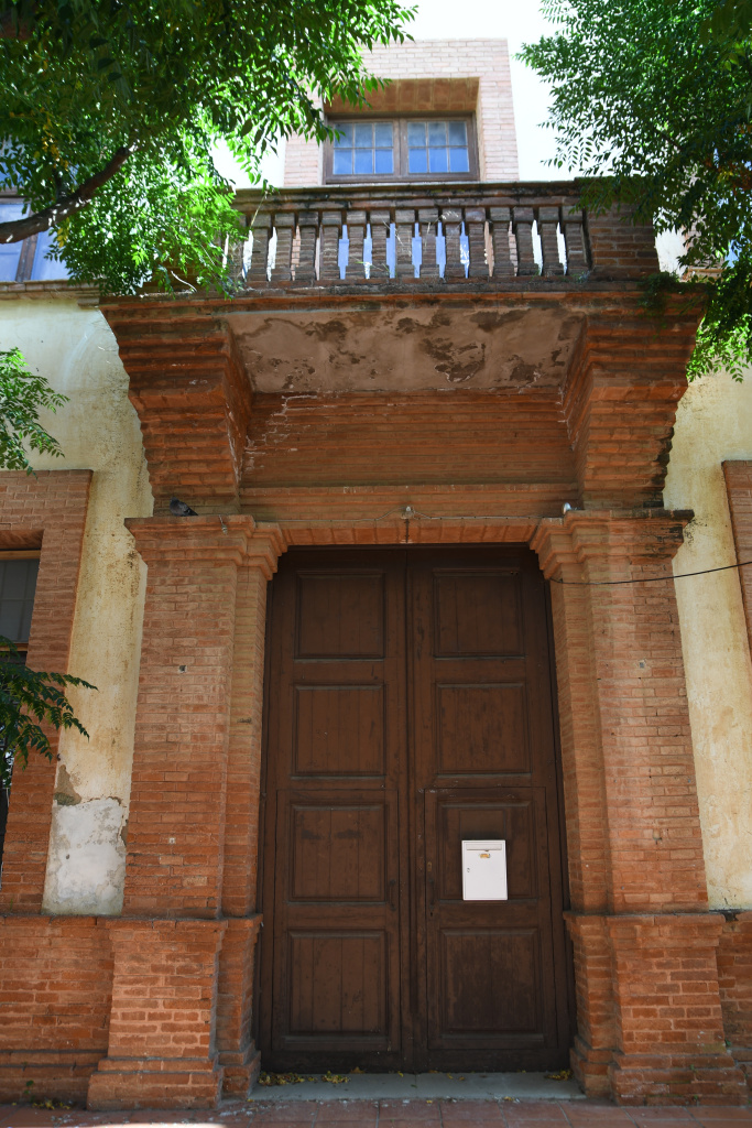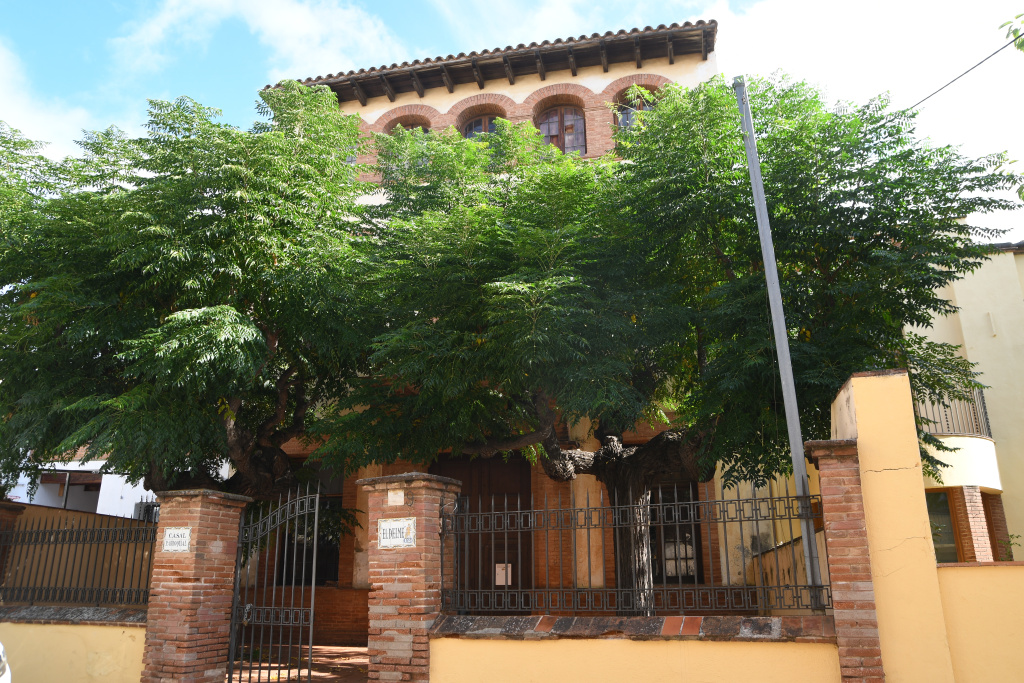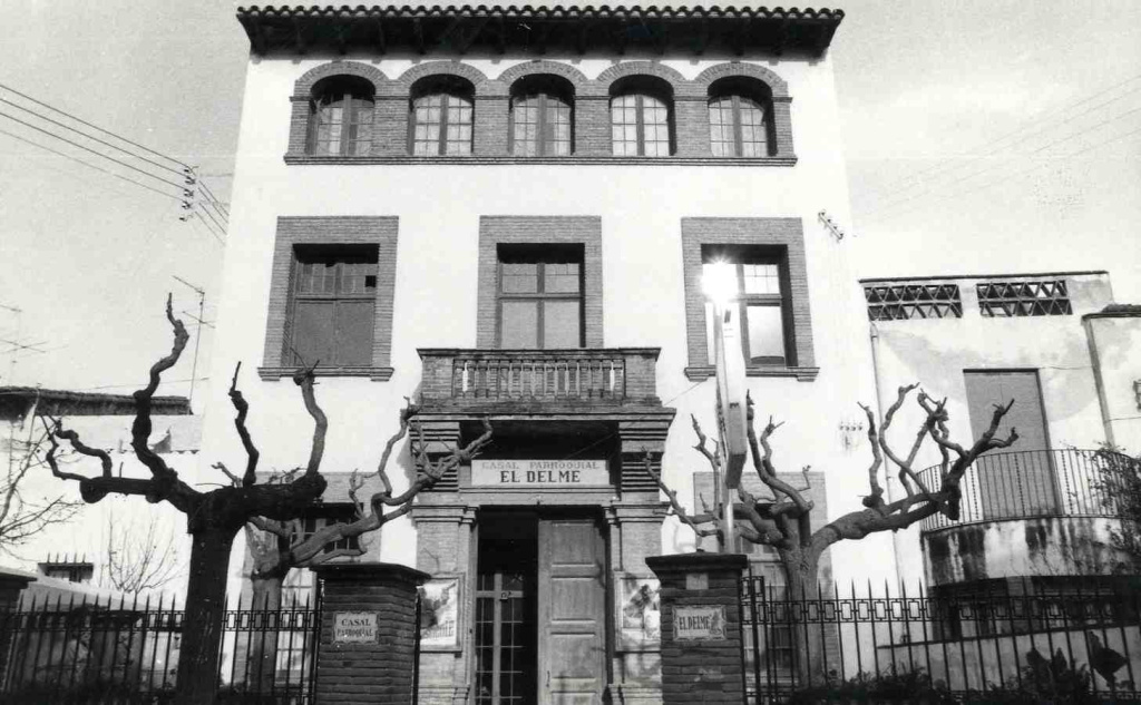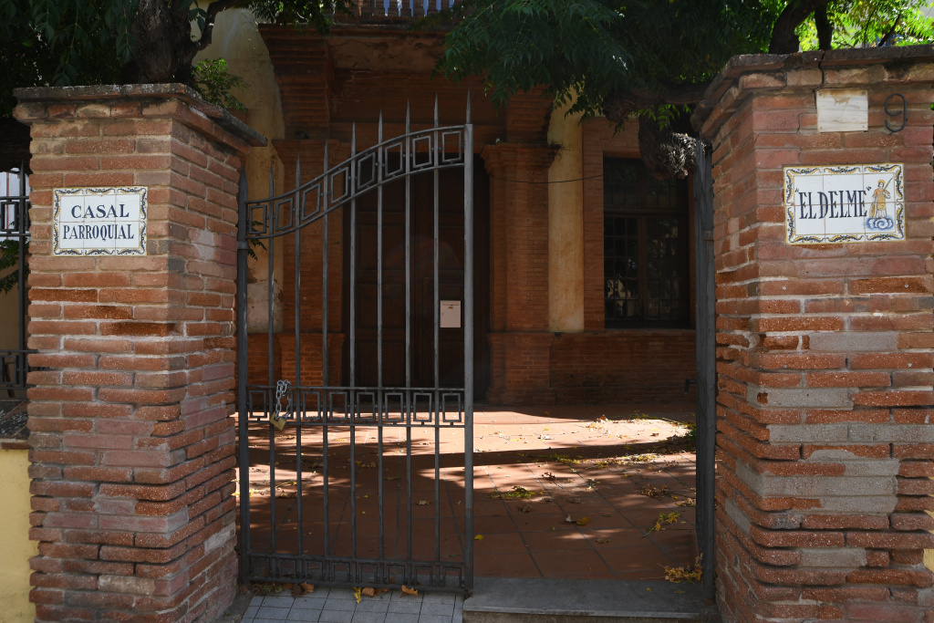 Entre la façana i el carrer hi ha un petit pati enrajolat i una tanca d'obra en delimita l'espai. Dos pilars de secció quadrada, fets de maó, centren la porta d'accés. El mateix que amb les baranes que hi ha damunt la paret, que són de ferro. En el pilar de l'esquerra hi ha un plafó ceràmic que posa "CASAL PARROQUIAL" i en el pilar de la dreta, n'hi ha un altre on es pot llegir: "EL DELME".