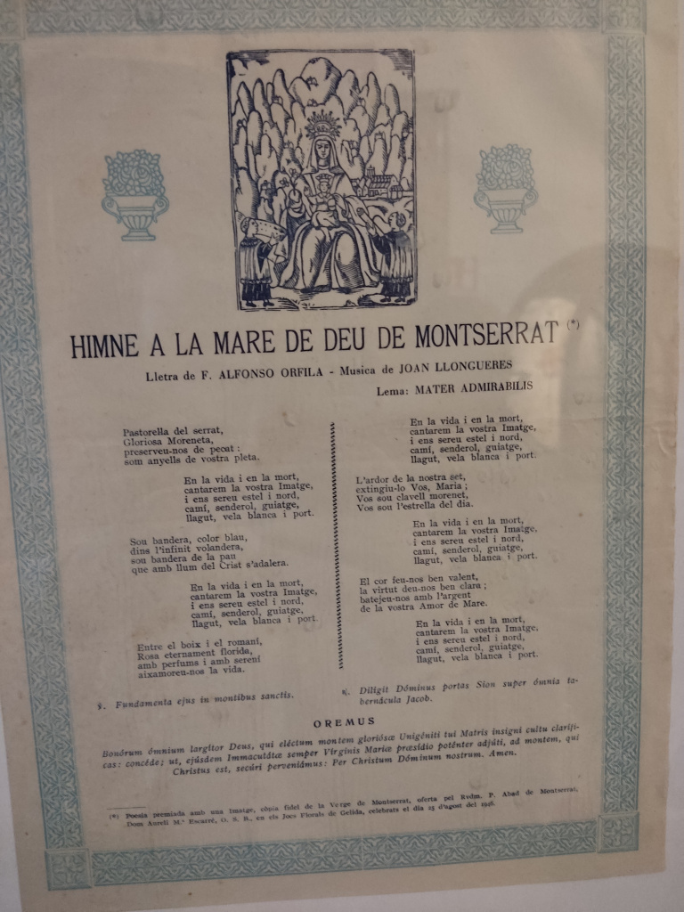 Com a curiositat, existeix un Himne a la Mare de Déu de Montserrat, configurat com un goig, amb lletra de F. Alfonso Orfila i música de Joan Llongueres. Aquest himne va ser estrenat durant els Jocs Florals de Gelida el 25 d'agost de 1946.