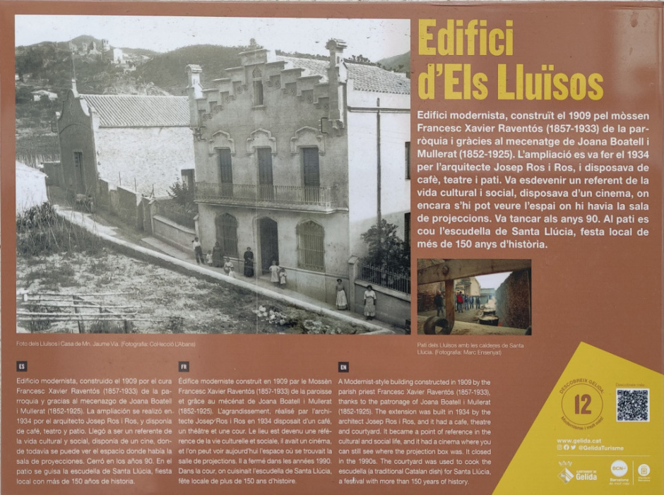 La construcció de l'edifici dels Lluïsos la va impulsar el llavors rector de Gelida, mossèn Francesc Xavier Raventós (1857-1933), el 1909 i va ser possible gràcies al mecenatge -7.500 pessetes- de Joana Boatell i Mullerat (1852-1925). El precedent el trobem el 1902, quan el mateix mossèn havia fundat a Cal Pepus, el local que tenia llogat, l'Associació de Sant Lluís Gonazaga, pensada per a nois i noies a partir de la primera comunió.