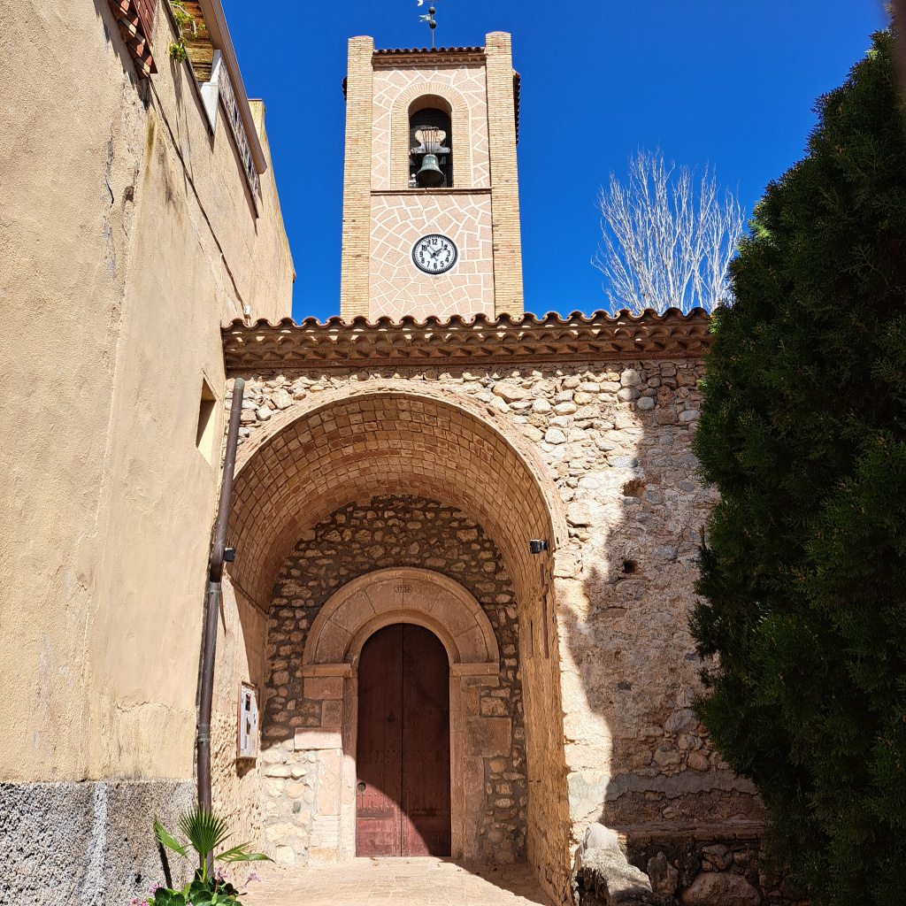 L'accés principal és dins un cos semicobert amb volta de canó de maó pla. El portal és adovellat amb arquivolta i guardapols i impostes motllurats, on hi consta gravat l'any "1734". El campanar, construït al segle XX, s'adossa al costat de gregal del temple i s'obre a la part superior amb un pòrtic d'arc de mig punt ceràmic a cada costat.