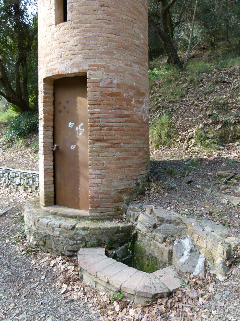 A més de la font, el conjunt destaca per una torre cilíndrica de maó vist de 7,5 m d’alçada, que presenta una porta d’accés a la base i una petita finestra per sobre de la porta. En origen, la torre estava coronada per les aspes d’un molí de ramell, tipologia de molí de vent emprat per bombar a la superfície l’aigua d’un pou. L’energia eòlica d’aquest molí, era transformada en energia mecànica que accionava un sistema de bomba de pistó per extreure l’aigua del pou situat a la base de la torre. El pou, de 2 m de diàmetre i 7 m de fondària, és el que proporciona l’aigua a l’altre gran element del conjunt, la bassa situada a pocs metres. Actualment, des de la restauració de l’any 2010, la torre disposa d’una placa fotovoltaica que és l’encarregada de proporcionar l’energia per fer funcionar la bomba.