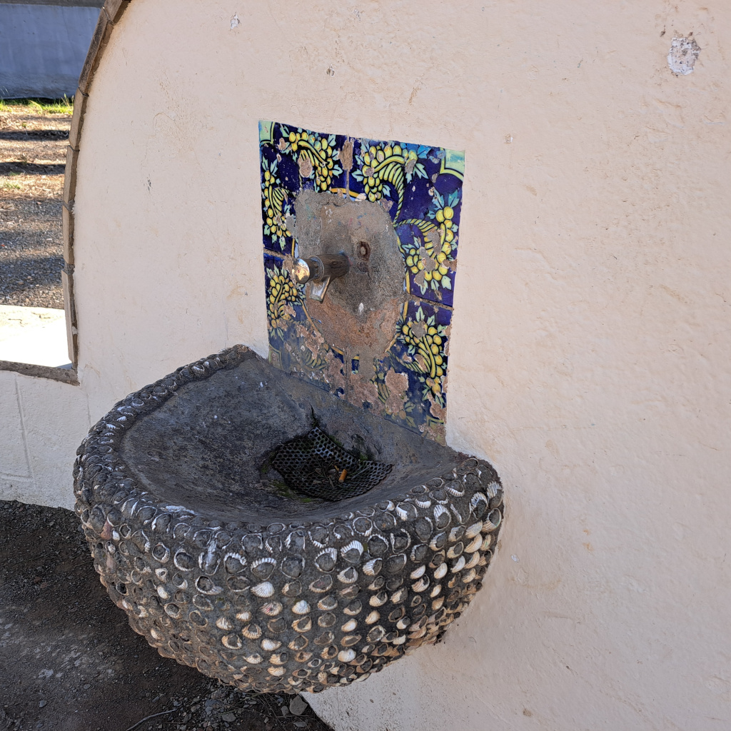 És una estructura semicircular amb un mur corbat a cada costat que fa de pedrís. A la part central hi ha un plafó de rajoles ceràmiques amb motius vegetals, amb una aixeta metàl·lica al centre. A sota trobem fixada una pica semicircular revestida amb petxines. La part superior de l'estructura està revestida amb lloses i la resta està arrebossada i pintada.