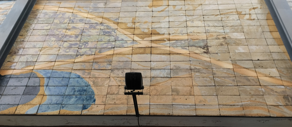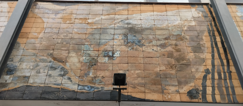 Els panells presenten unes dimensions de 2,80 x 1,70 m, els dos més petits fets amb 221 rajols de 20 x 10 cm; i 3,40 x 1,70 m els quatre més grans realitzats amb 255 rajols de 20 x 10 cm.