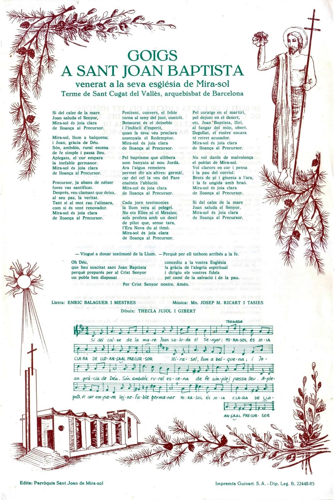 Goigs dedicats a Sant Joan Baptista, sant titular de l'església parroquial del barri de Mira-sol. Aquesta església va ser consagrada el 25 de juny de 1975, festivitat de Sant Joan, pel cardenal i arquebisbe de Barcelona Narcís Jubany.