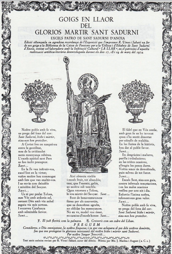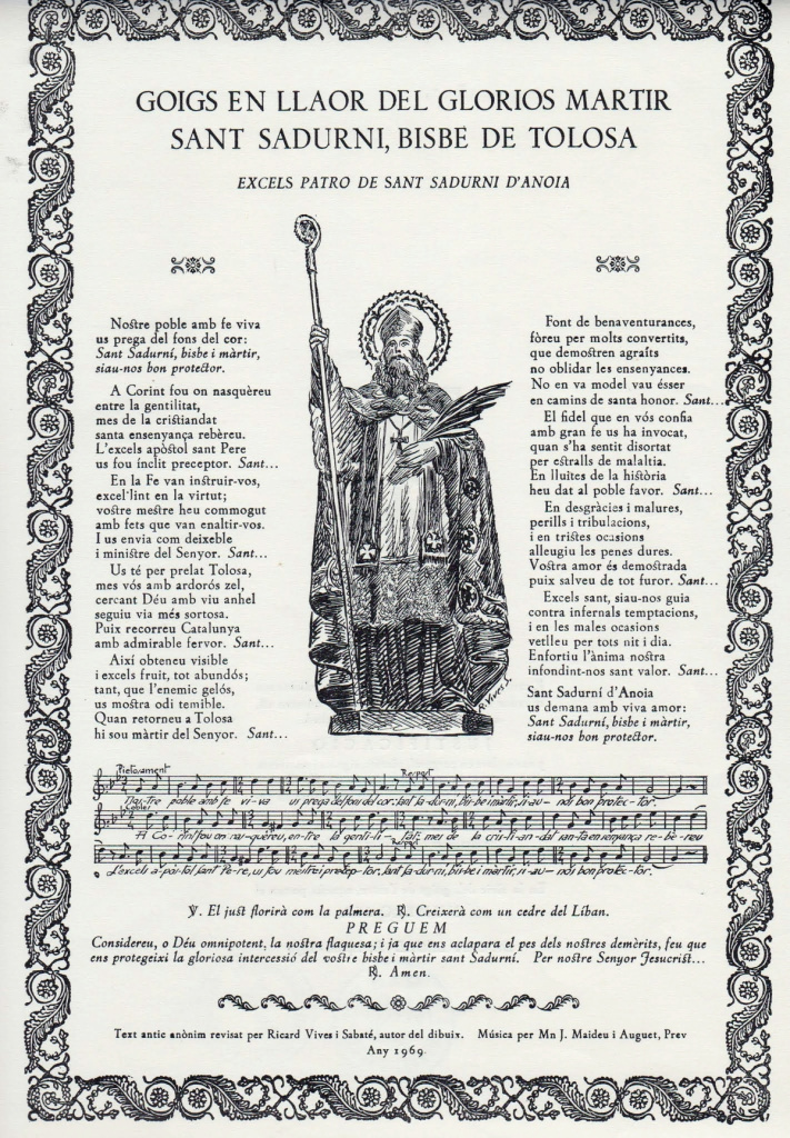 Aquesta composició poètica glossa a Sant Sadurní, patró del municipi. Es recopilen tres edicions, una existent com a mínim de 1956, amb lletra de Jaume Rosell i Roig, música de Mn. Amadeu Ollé i gravat de Joan Pascual Garriga. Una segona edició a càrrec d’Antoni Sàbat Aguilera.